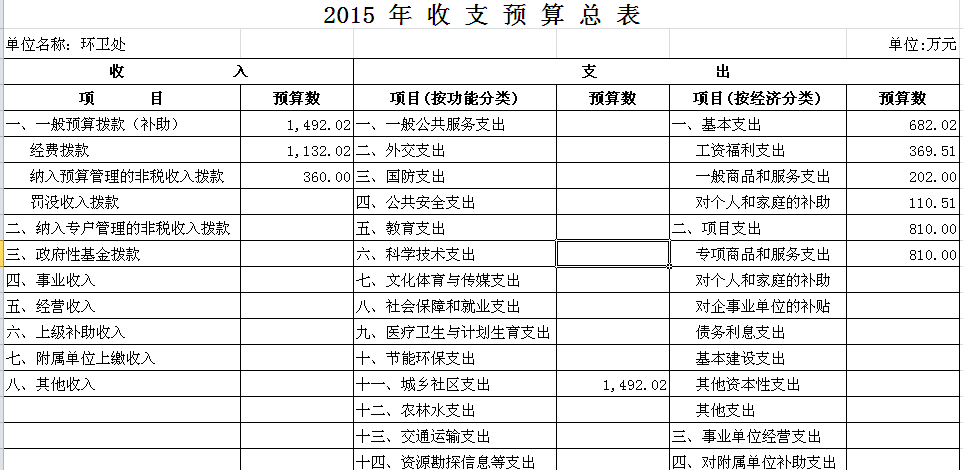 预算总支出1492.02万元,其中:基本支出682.02万元(工资福利支出369.51万元、一般商品和服务支出202万元、对个人和家庭补助支出110.51万元),项目支出810万元。