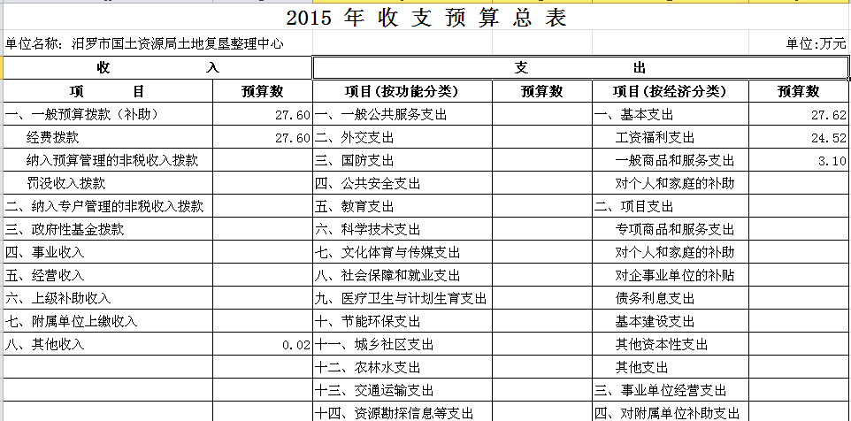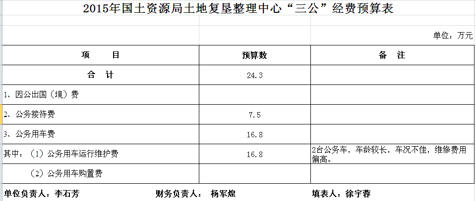 2015年国土资源局土地复垦整理中心收支预算总表及“三公”经费预算表
