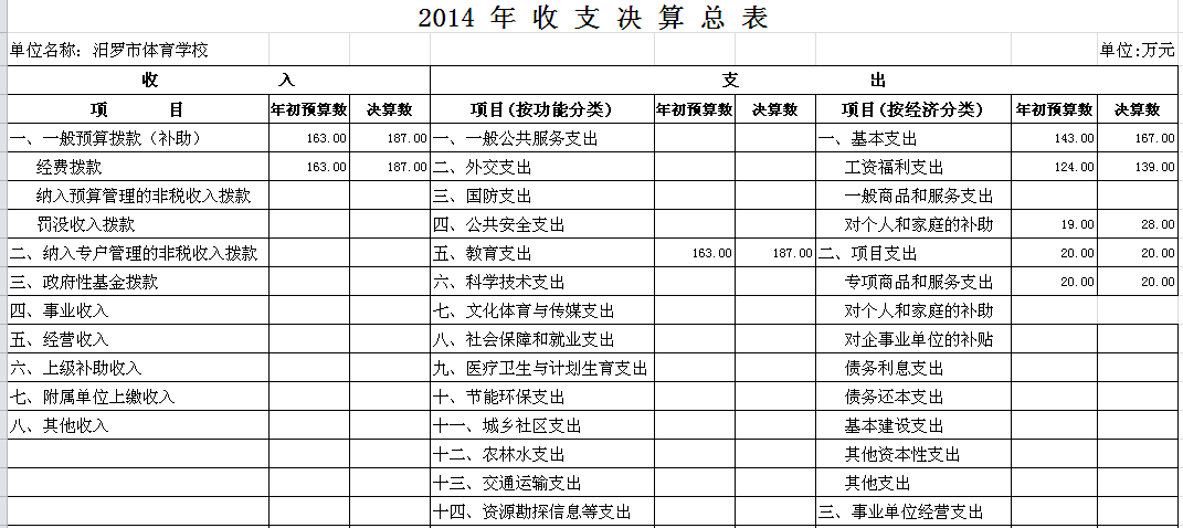 2014年汨罗市体育学校部门单位决算和“三公”经费决算公开表