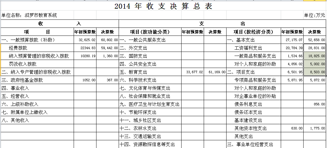 2014年汨罗市教育系统部门单位决算和“三公”经费决算公开表