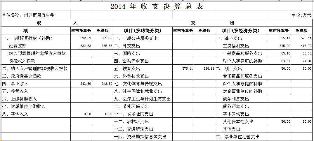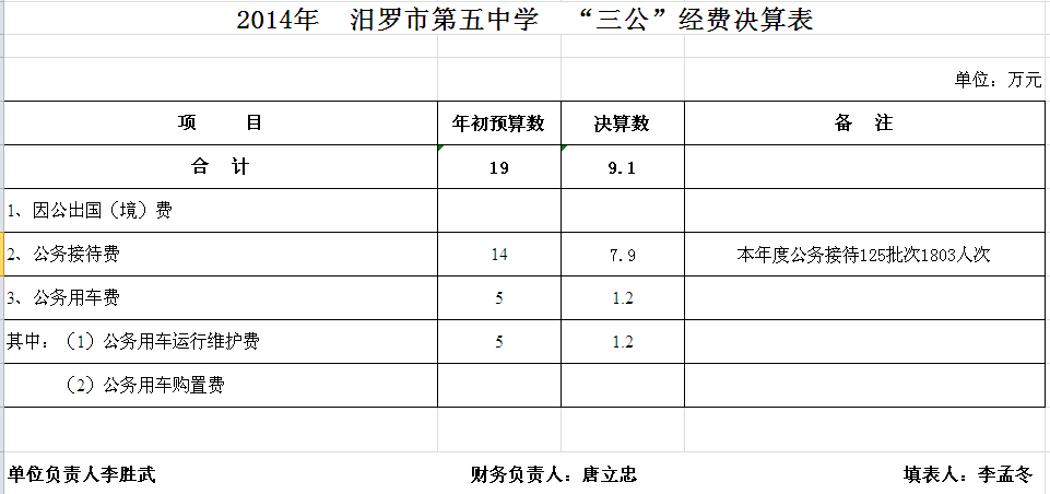 2014年汨罗市第五中学部门单位决算和“三公”经费决算公开表