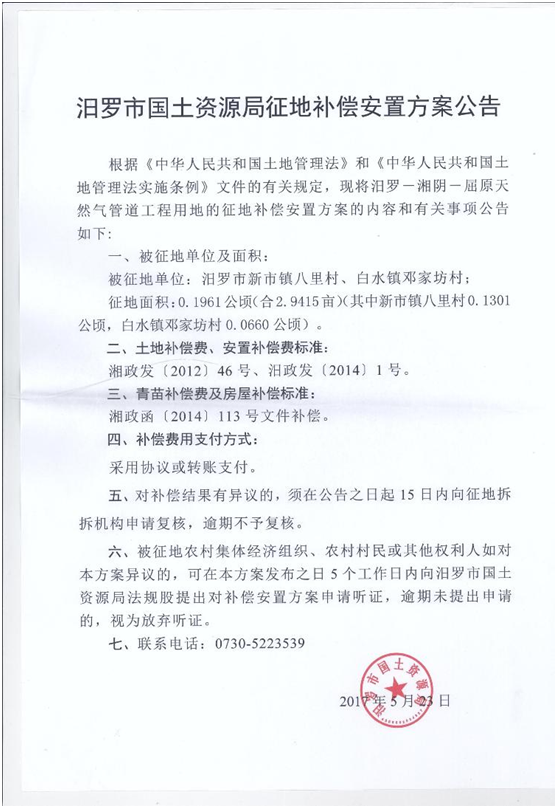 2017年5月汨罗市国土资源局征地补偿安置方案公告