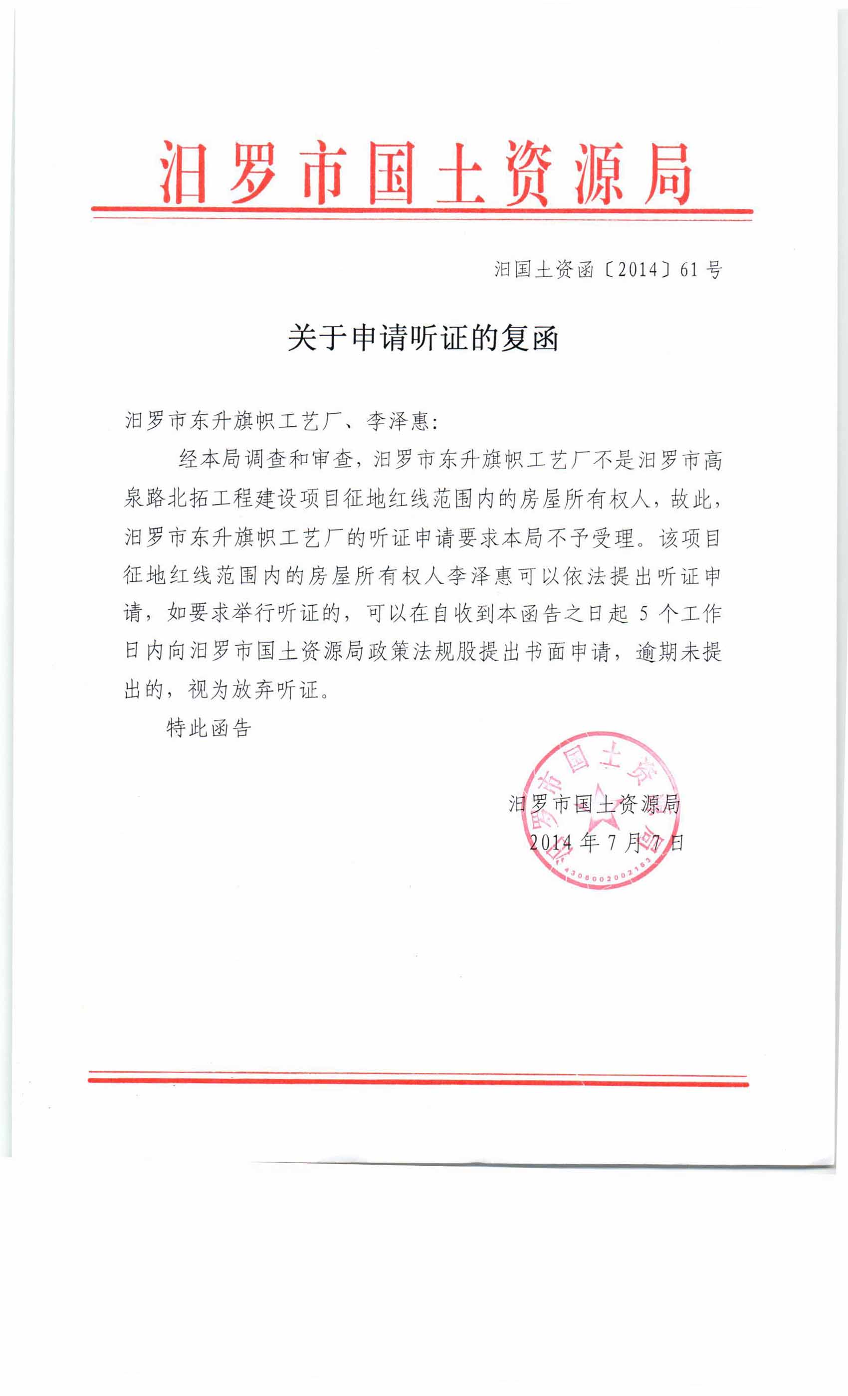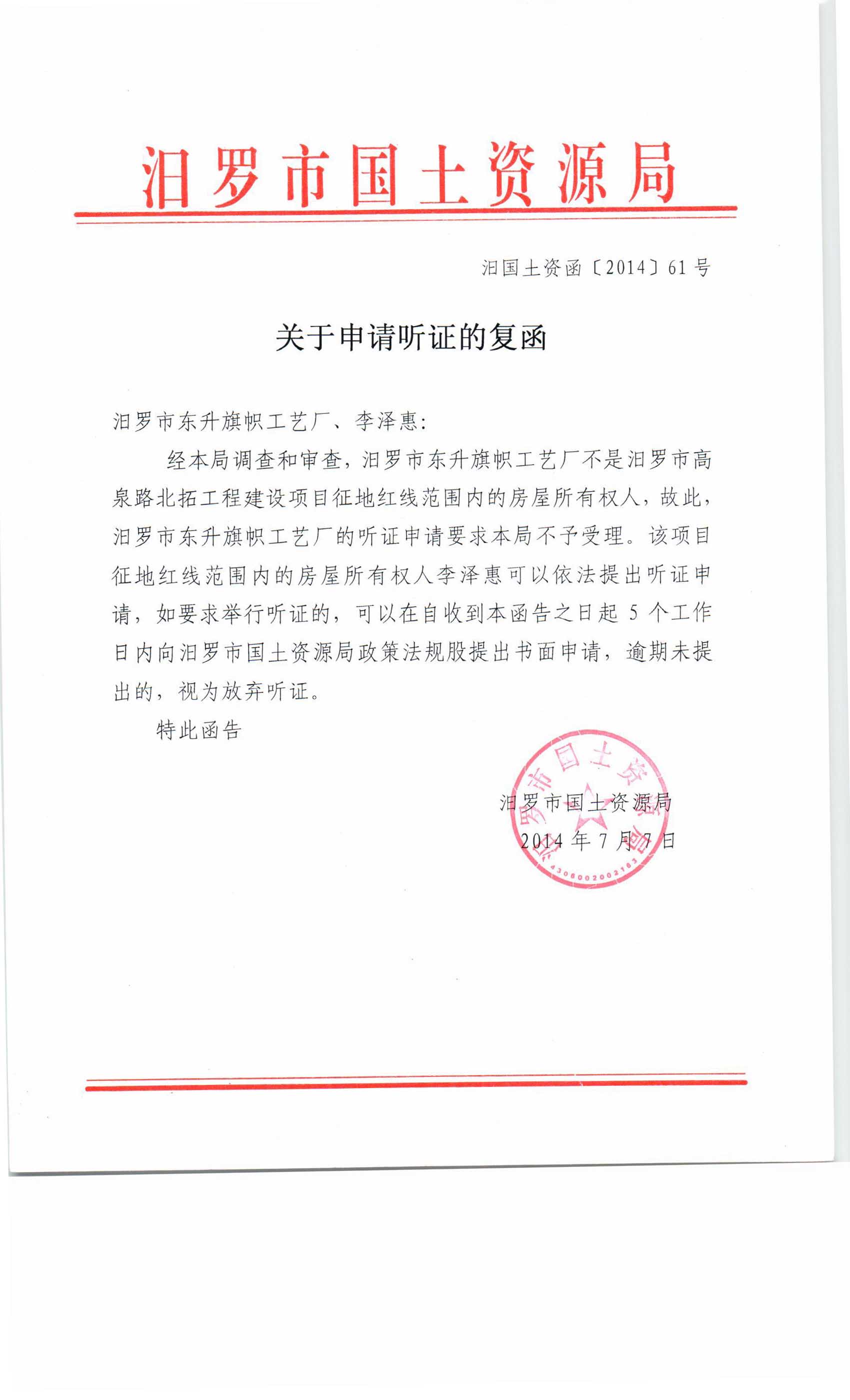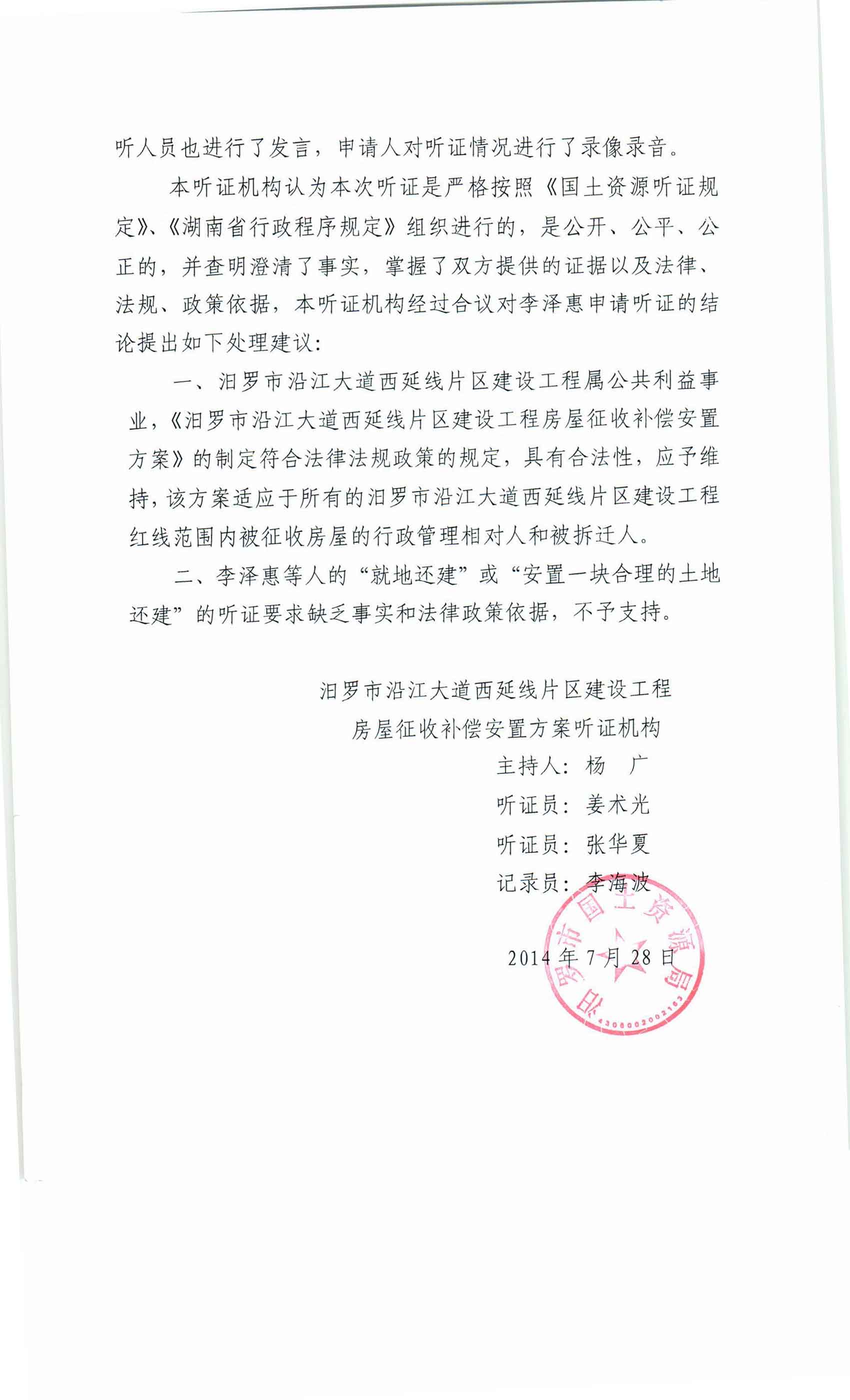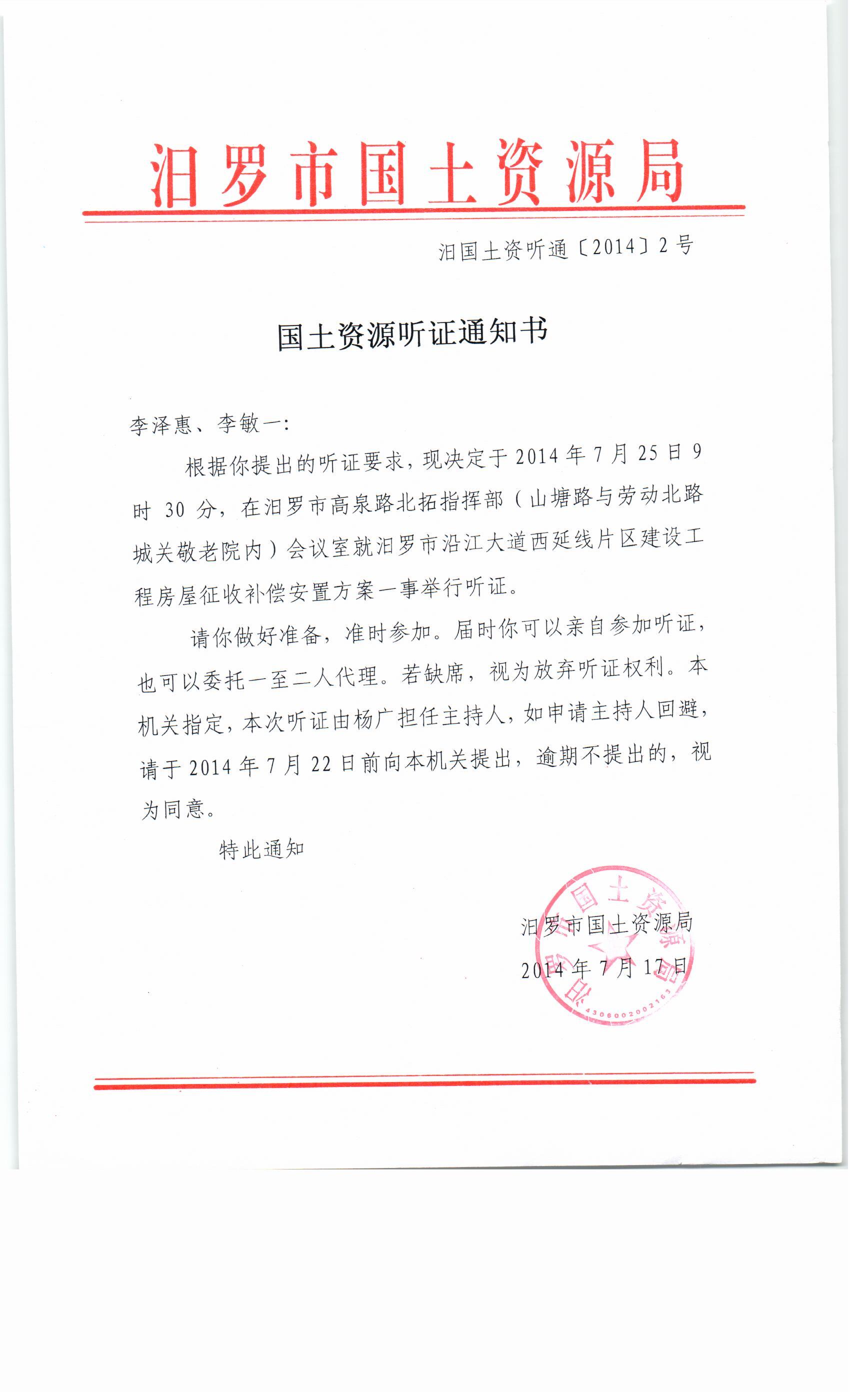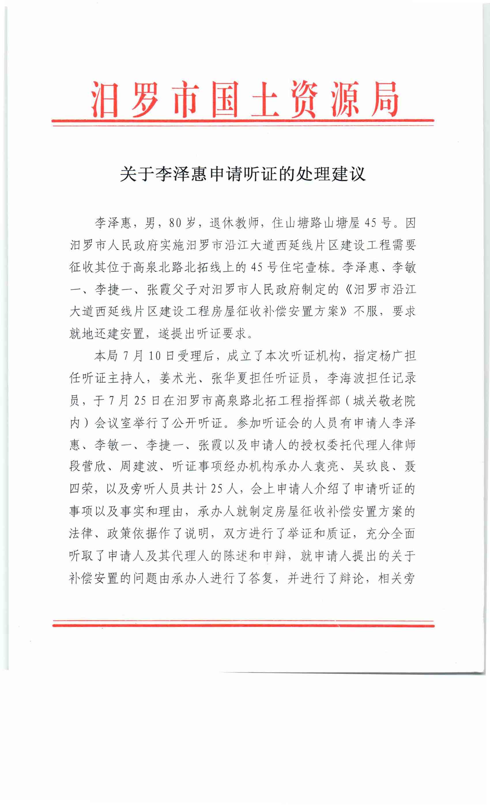 汨罗市高泉北路工程征地补偿安置方案听证会
