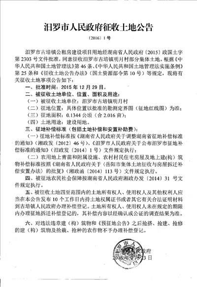 汨罗市人民政府征收土地公告