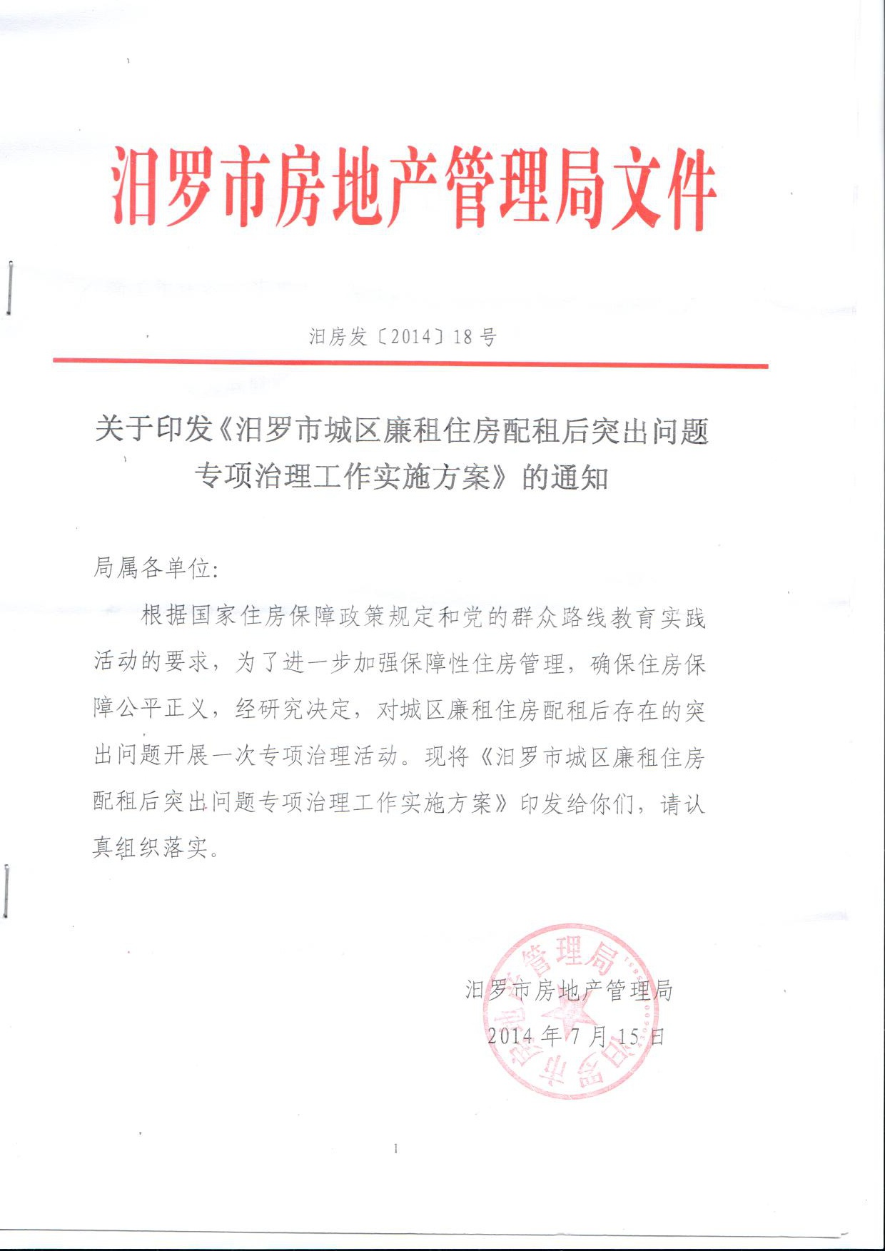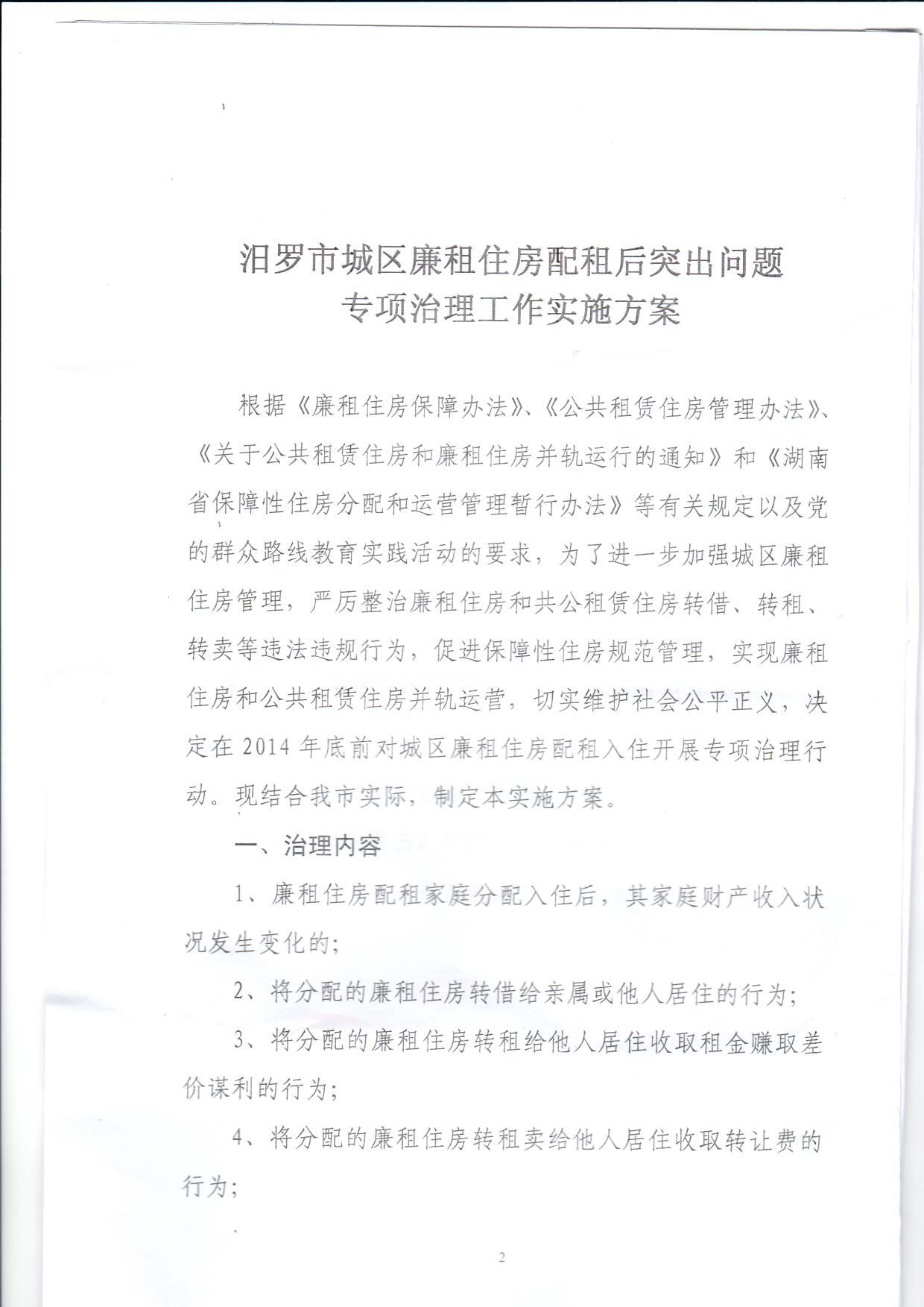 关于印发《汨罗市城区廉租住房配租后突出问题专项治理工作实施方案》的通知