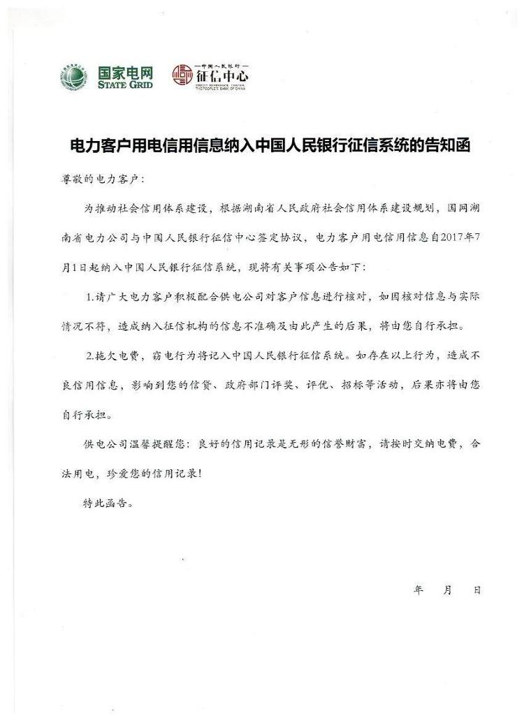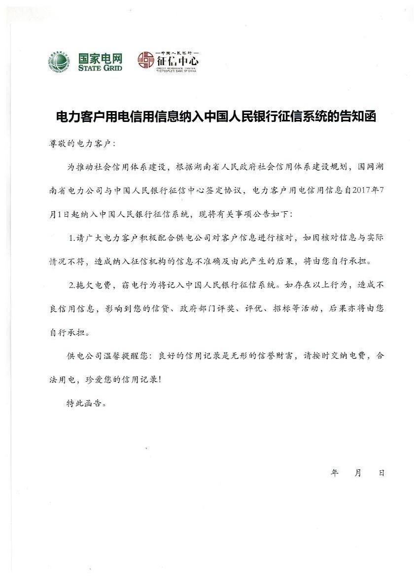 电力客户用电信用信息纳入中国人民银行征信系统的告知函