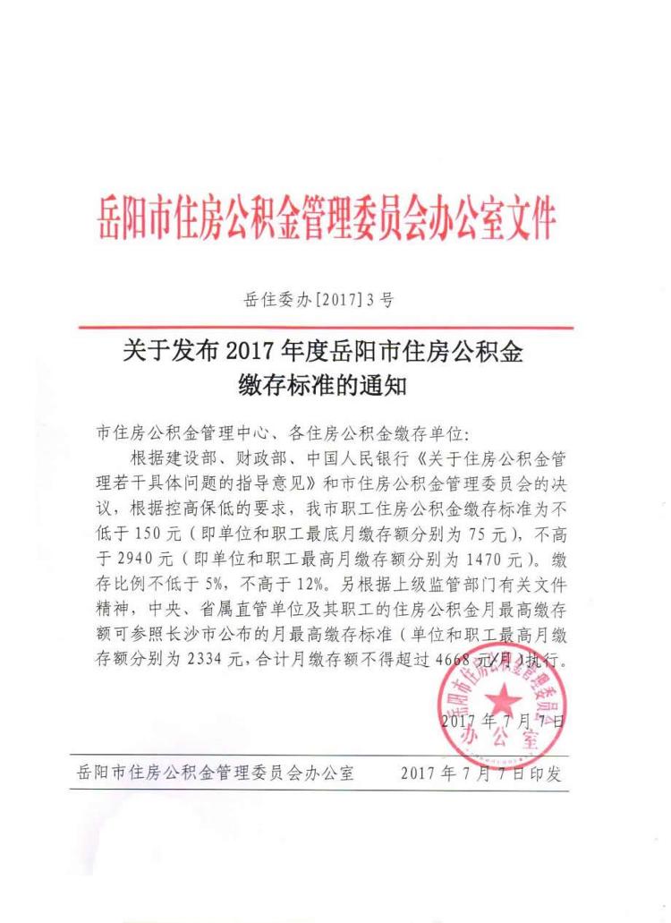 关于发布2017年度岳阳市住房公积金缴存标准的通知