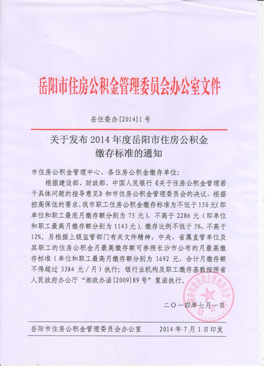 关于发布2014年度岳阳市住房公积金缴存标准的通知