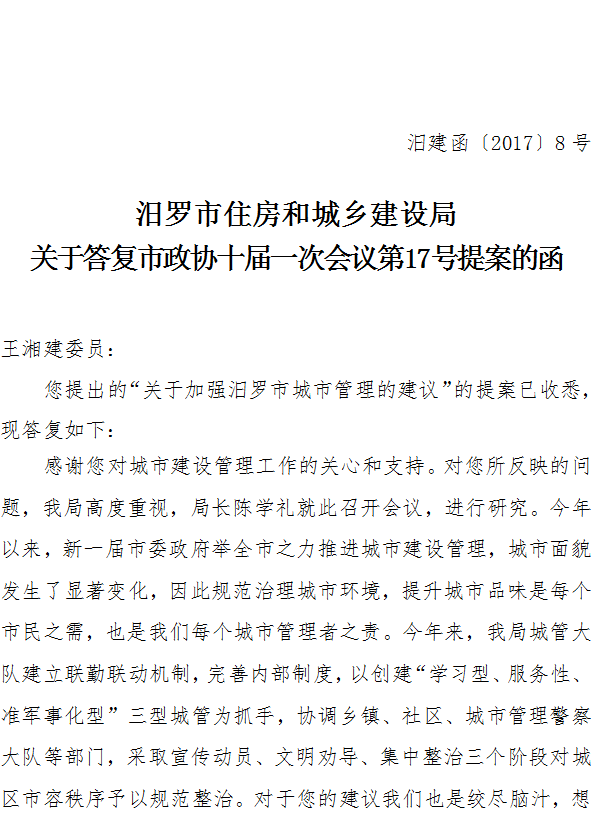 汨罗市住房和城乡建设局 关于答复市政协十届一次会议第17号提案的函