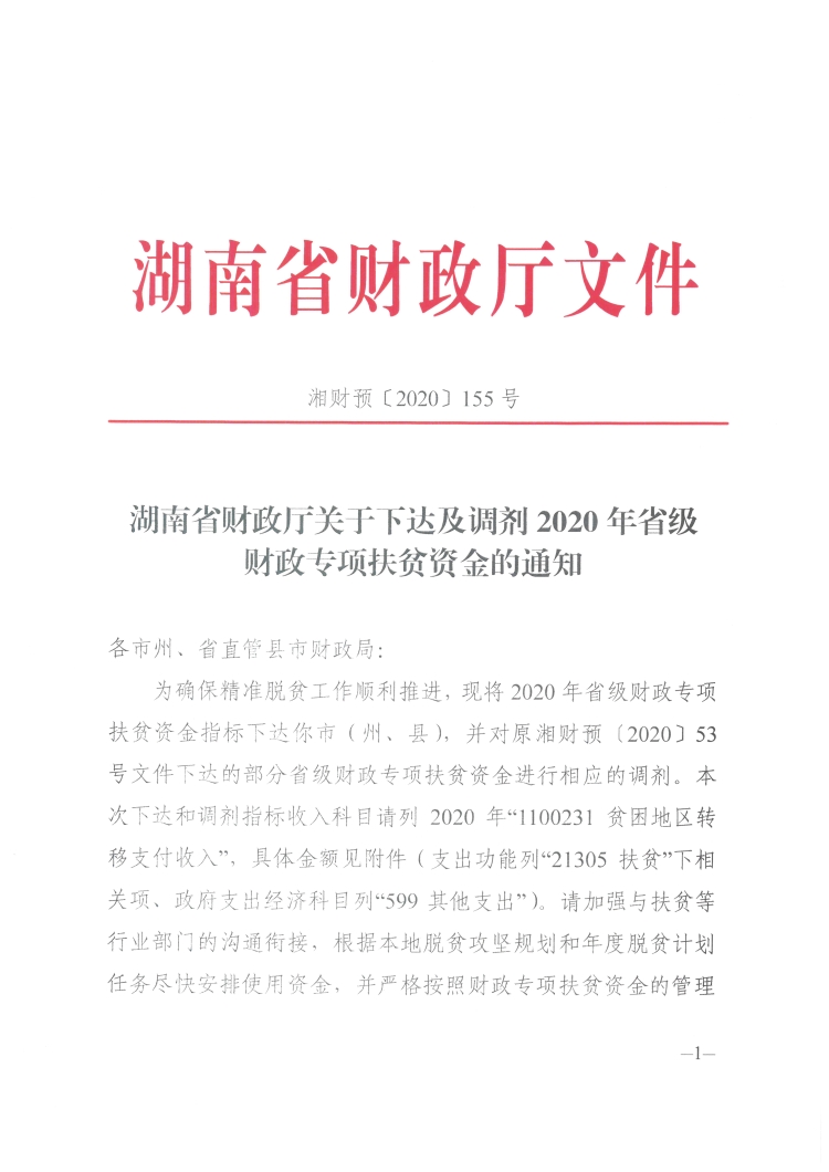 关于下达及调剂2020年省级财政专项扶贫资金的通知