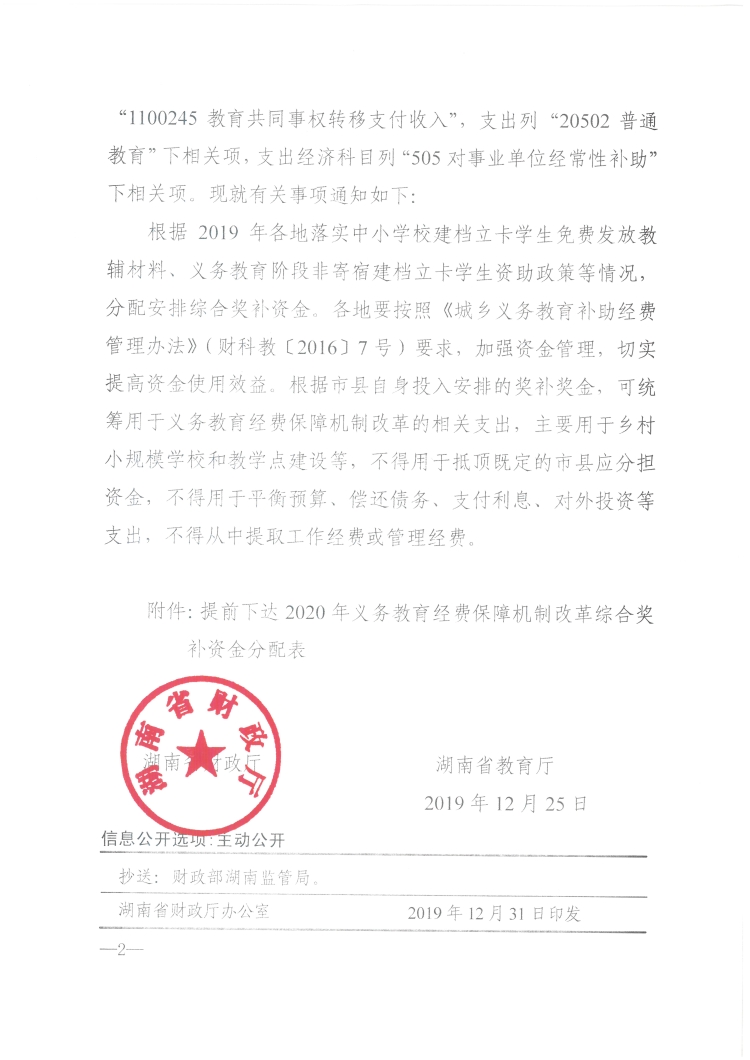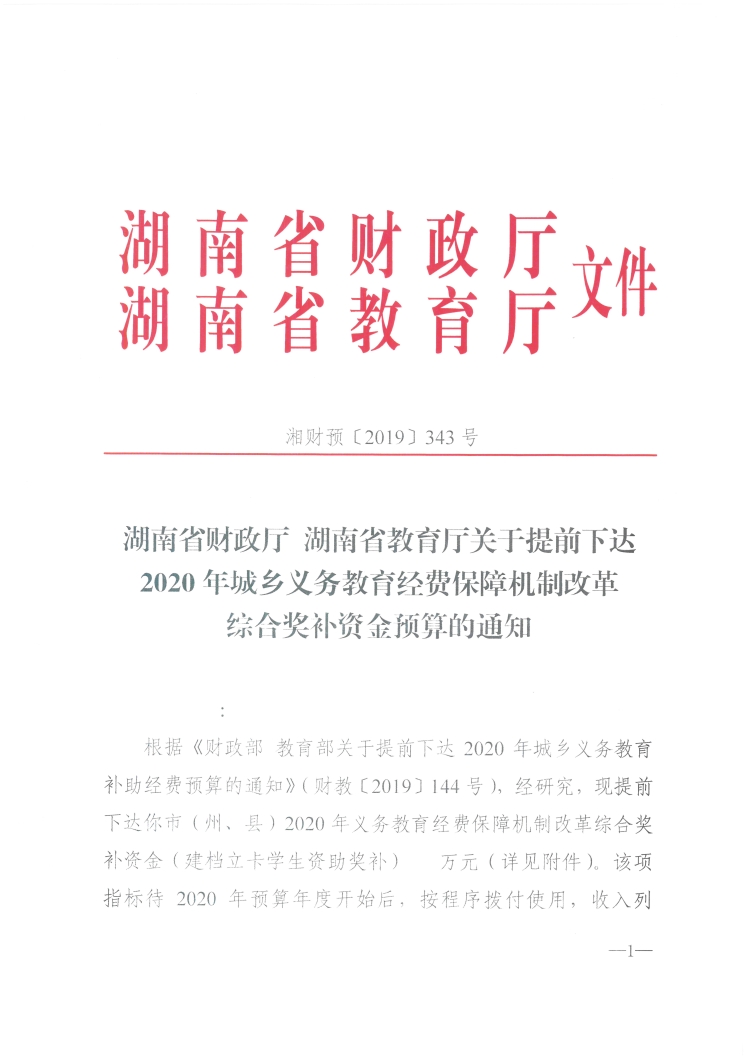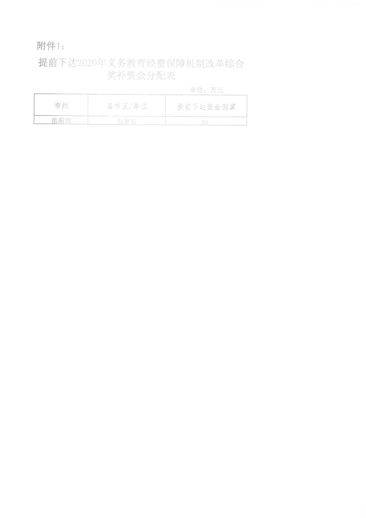 关于提前下达2020年城乡义务教育经费保障机制改革综合奖补资金预算的通知