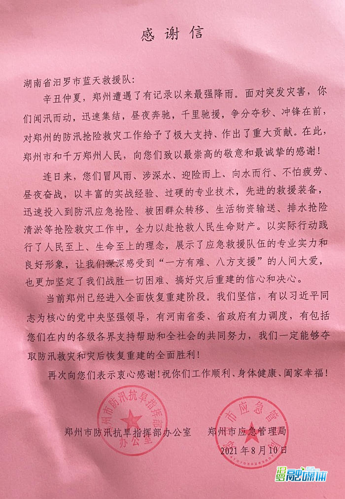 汨罗融媒体讯(记者 夏凡)近日,汨罗市蓝天救援队收到一封来自郑州的感谢信。信中,郑州市防汛抗旱指挥部办公室、郑州市应急管理局代表郑州市和千万郑州人民,向汨罗市蓝天救援队千里驰援郑州灾区参加抢险救灾,致以最崇高的敬意和最诚挚的感谢。