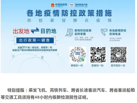 特别提醒:乘坐飞机、高铁列车、跨省长途客运汽车、跨省客运船舶等交通工具须持有48小时内核酸检测阴性证明。