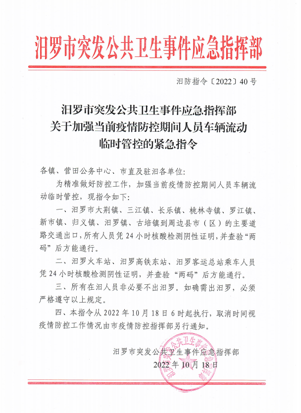 紧急指令!汨罗加强当前疫情防控期间人员车辆流动临时管控