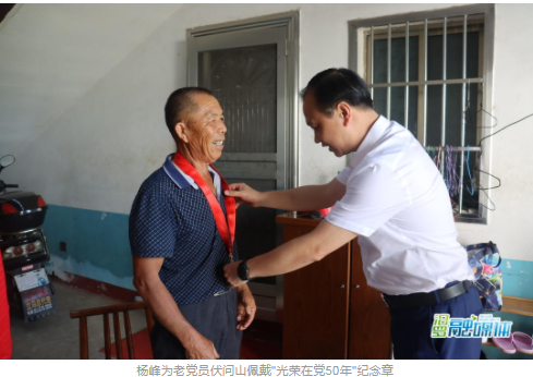 杨峰为苏要春佩戴好"光荣在党50年"纪念章,并祝福老人身体健康、生活幸福,并希望各级党组织结合党史学习教育,通过学习党的光荣历史,汲取精神力量,进一步坚定理想信念,增强"四个自信",发扬好党的优良传统。
