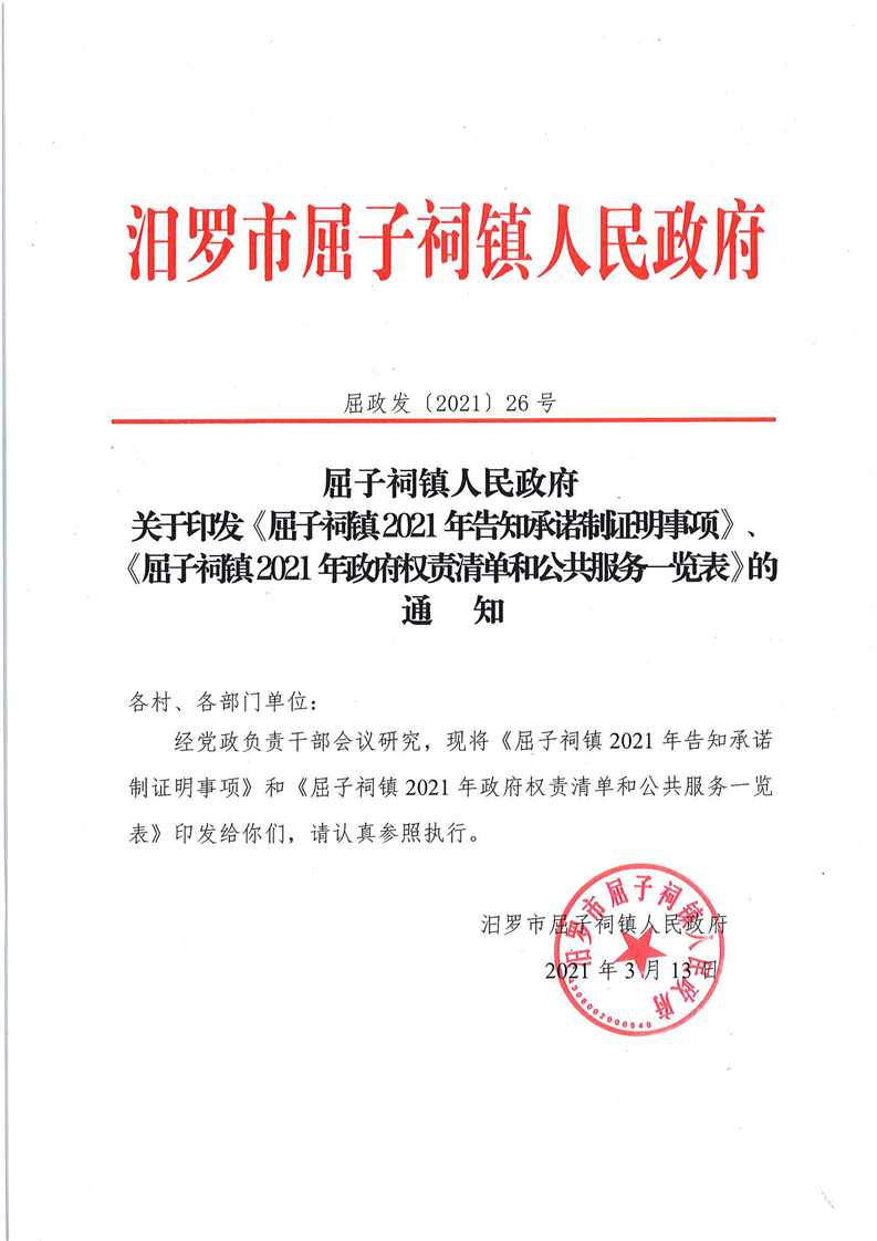 关于印发《屈子祠镇2021年告知承诺制证明事项》、《屈子祠镇2021年政府权责清单和公共服务一览表》的通知