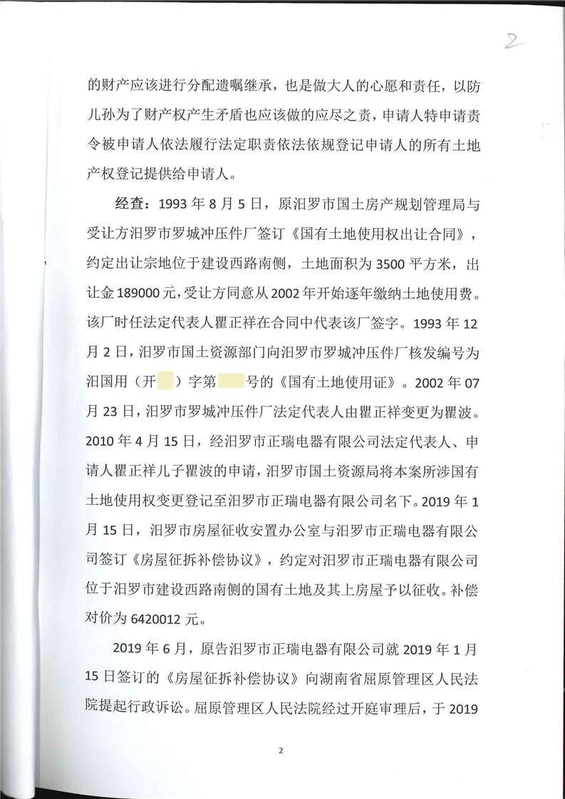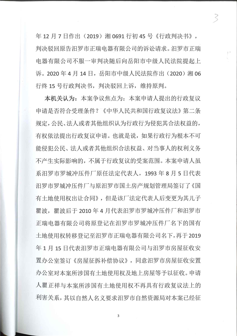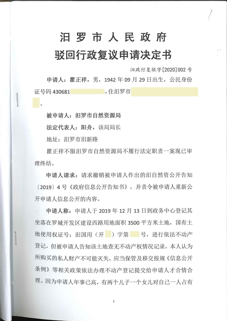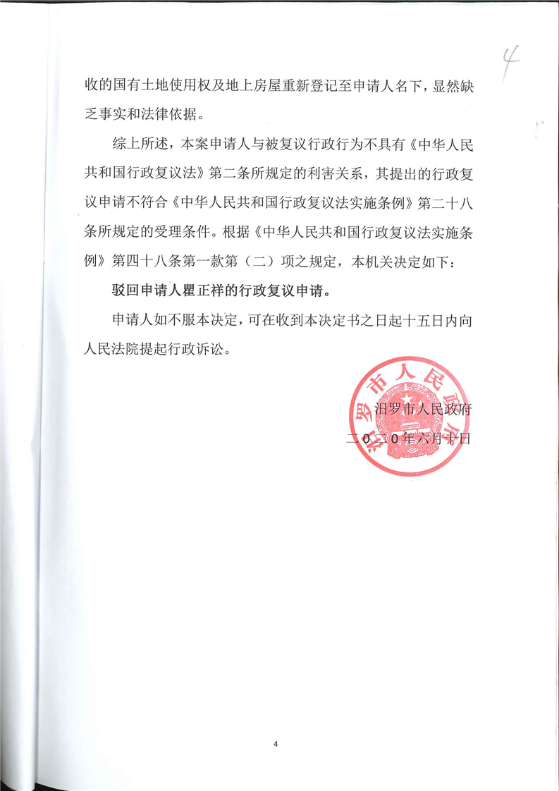 汨罗市人民政府驳回行政复议申请决定书(瞿正祥)