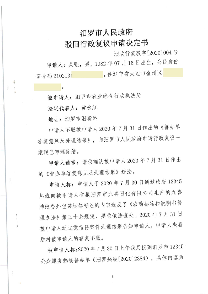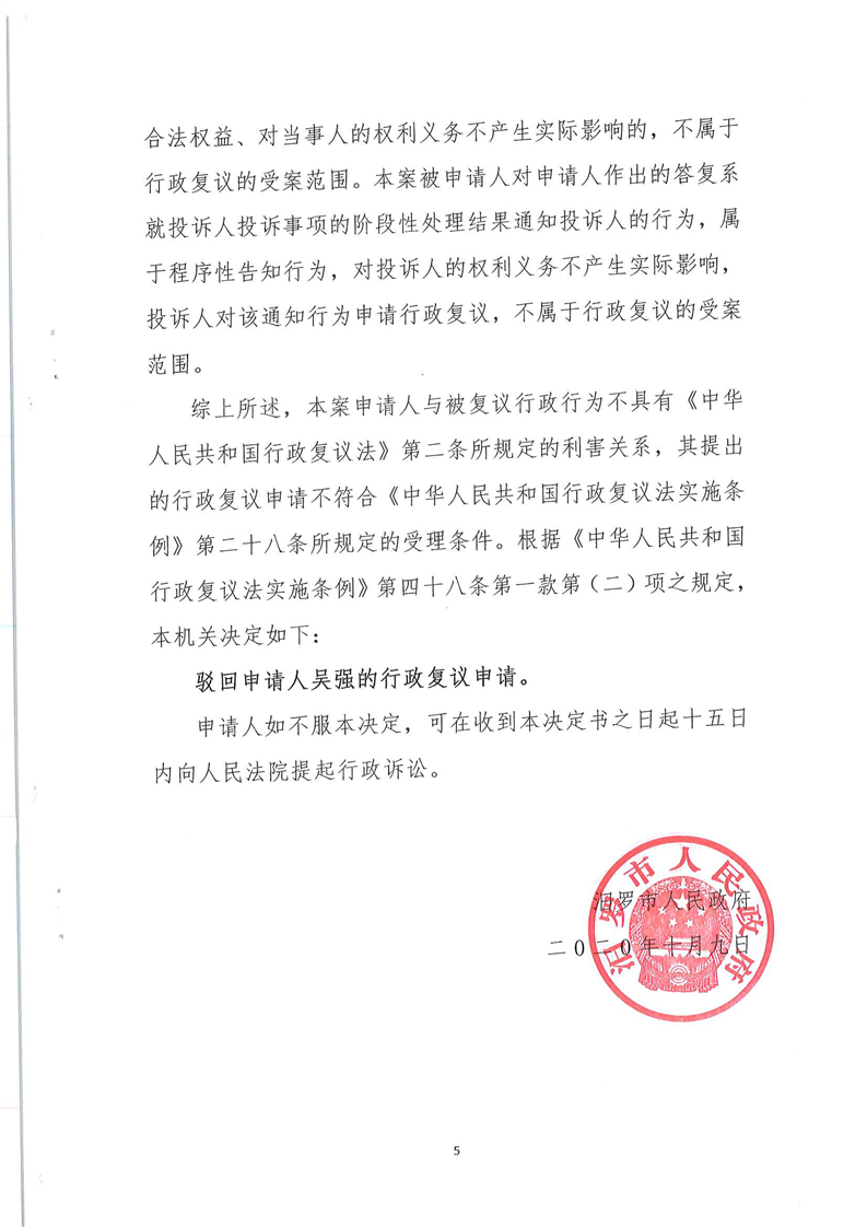 汨罗市人民政府驳回行政复议申请决定书(吴强)