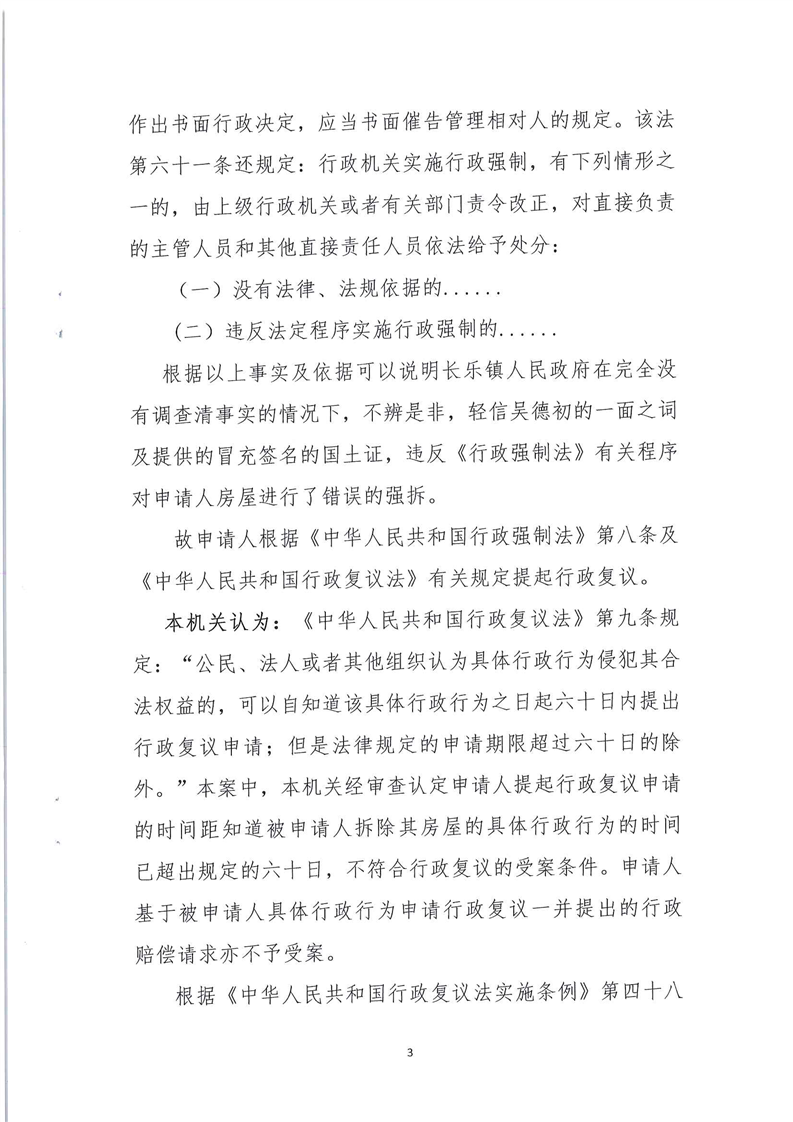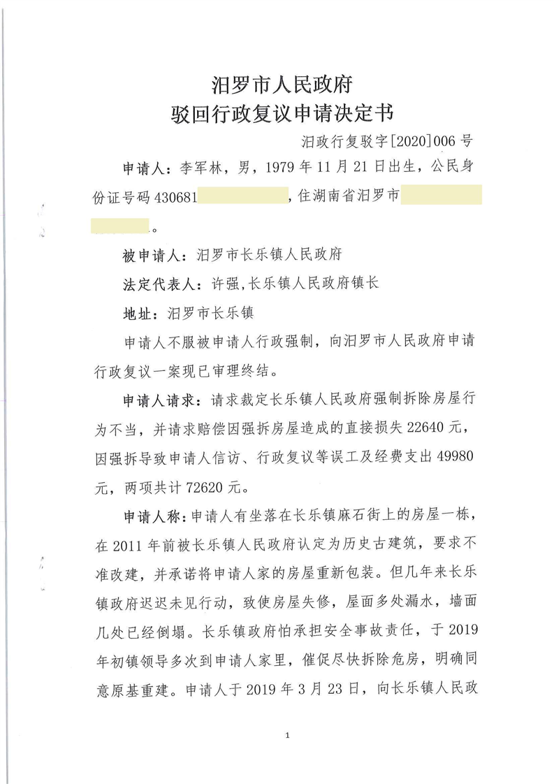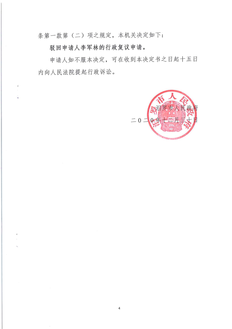 汨罗市人民政府驳回行政复议申请决定书(李军林)
