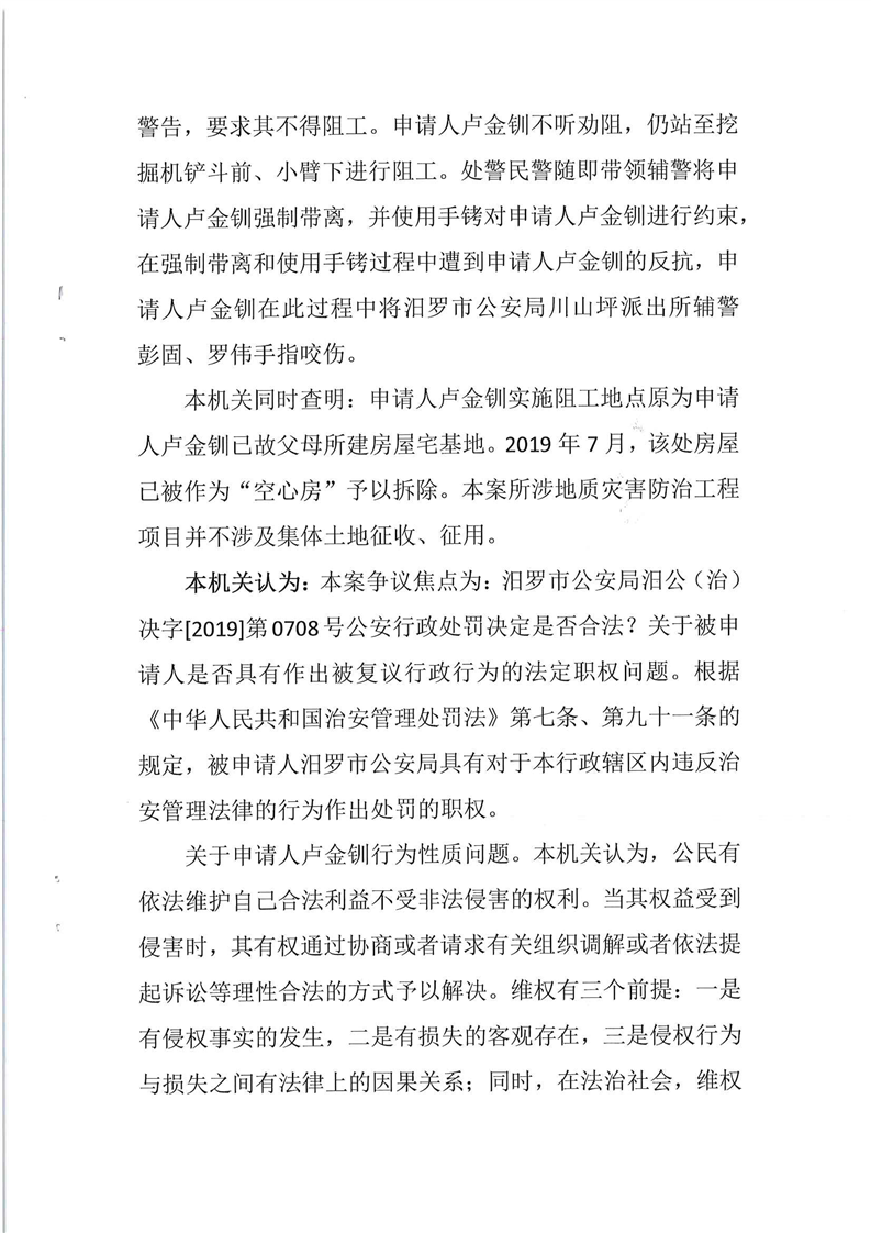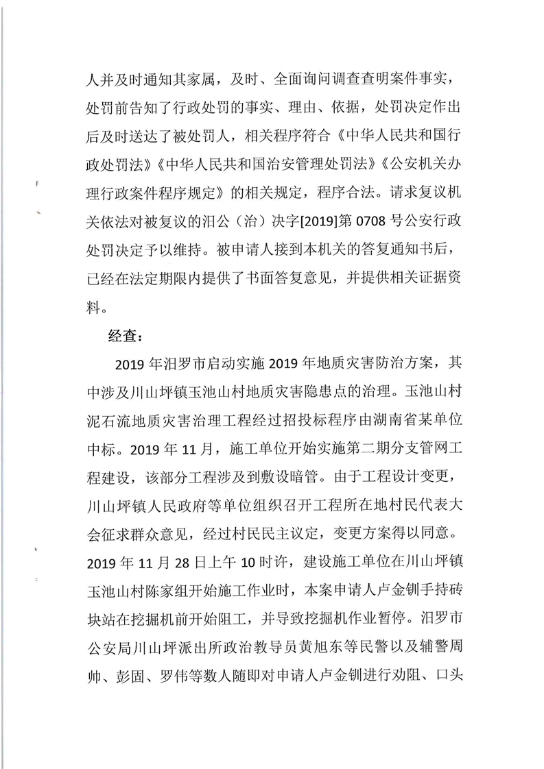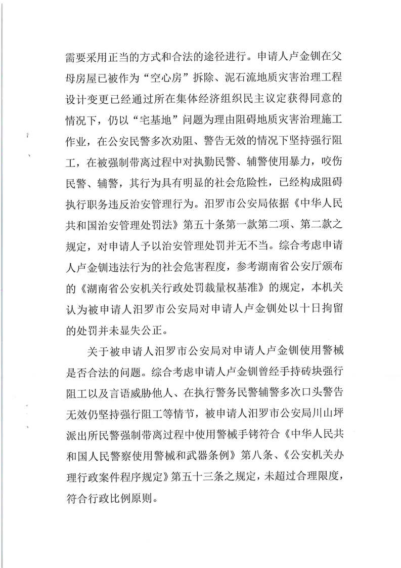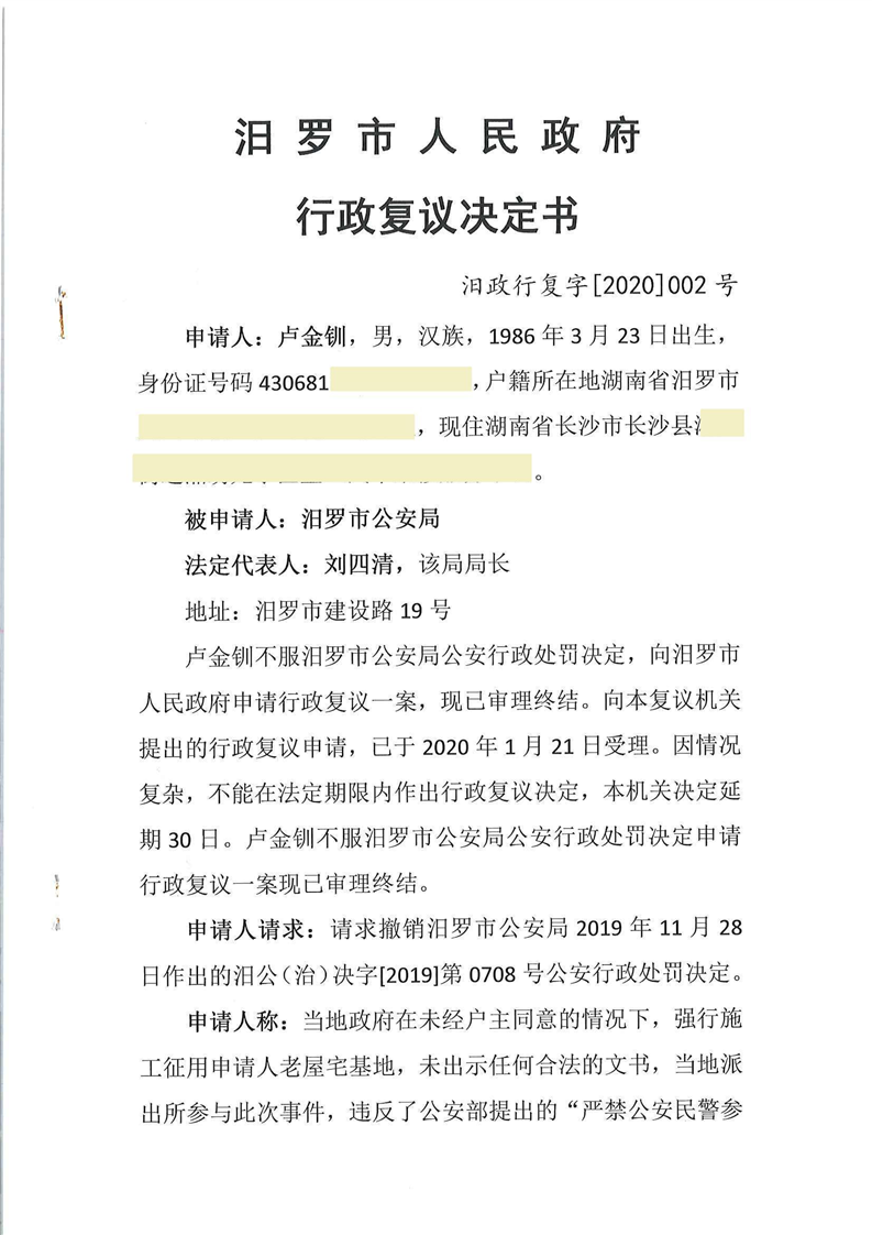 汨罗市人民政府行政复议决定书(卢金钏)