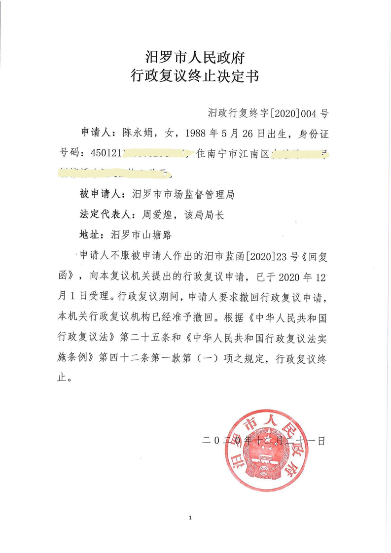 汨罗市人民政府行政复议终止决定书(陈永娟)