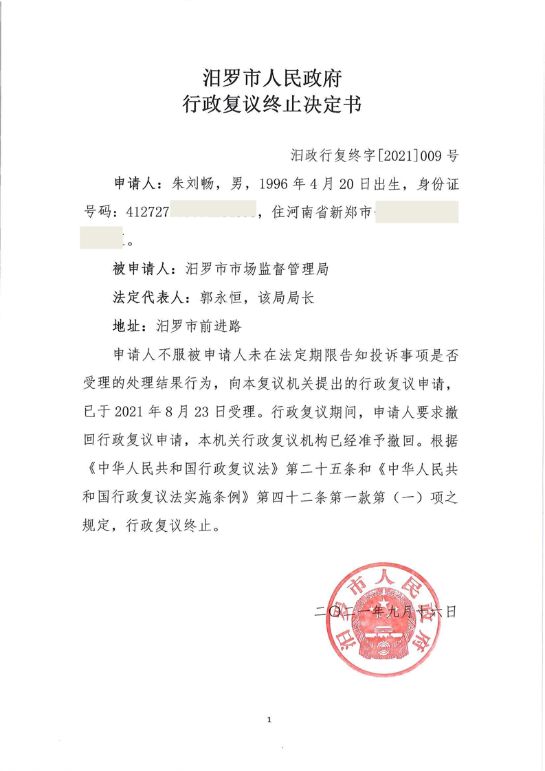 汨罗市人民政府行政复议终止决定书(朱刘畅)