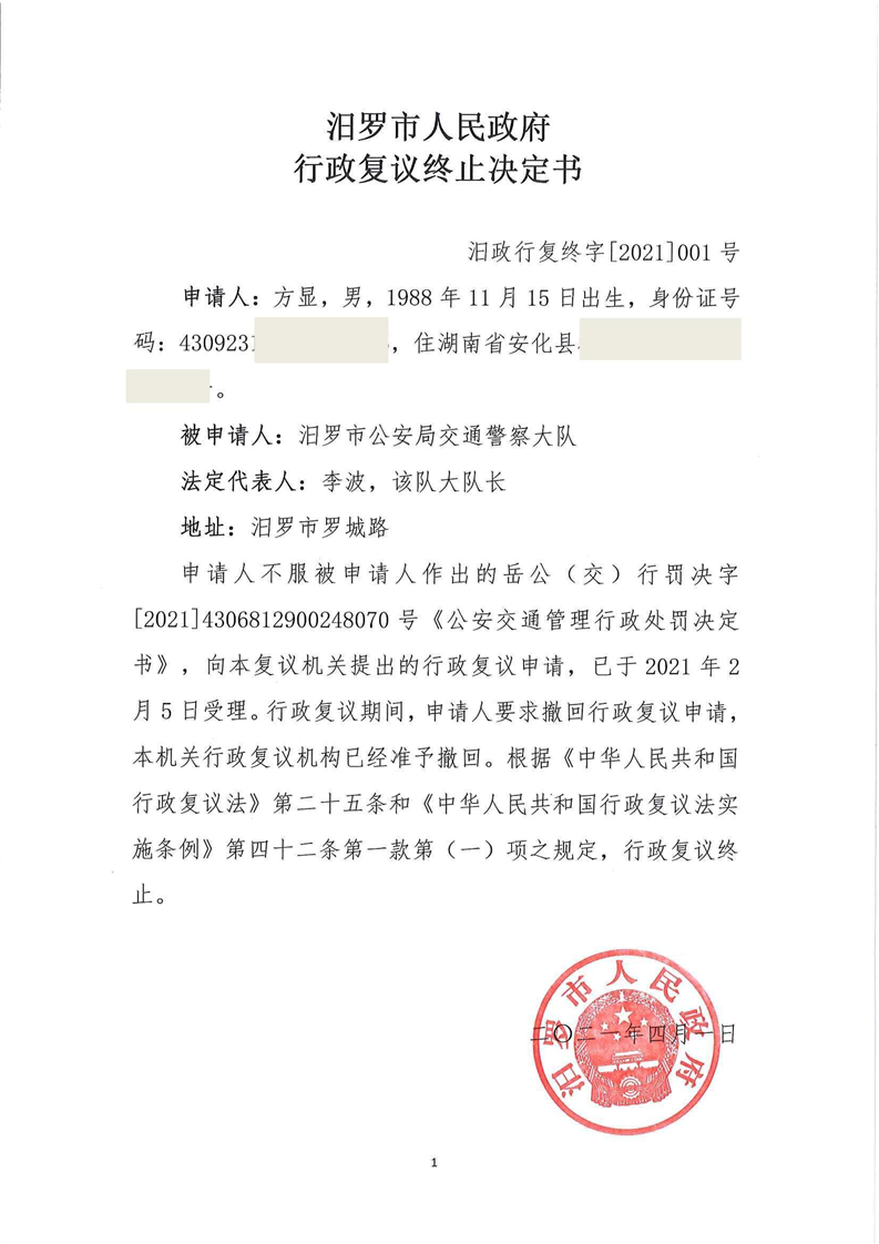 汨罗市人民政府行政复议终止决定书(方显)