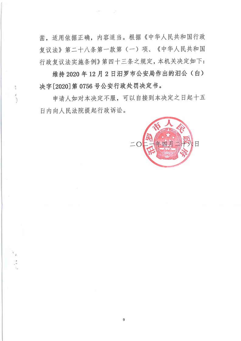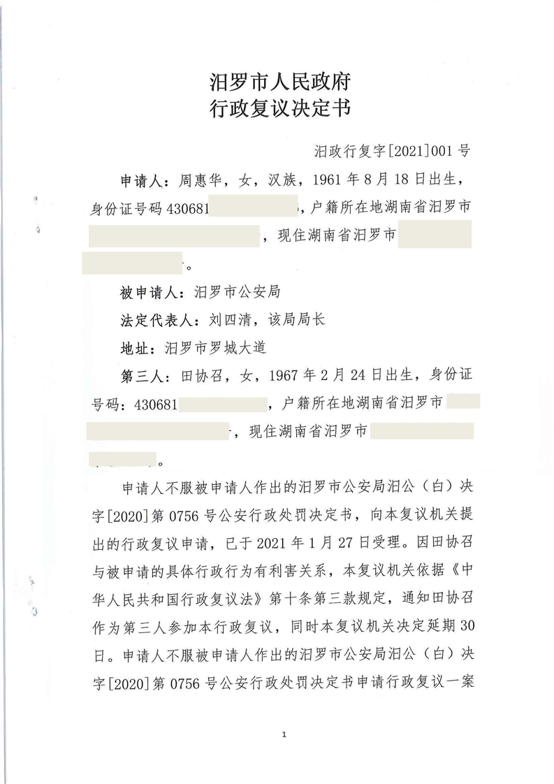 汨罗市人民政府行政复议决定书(周惠华)