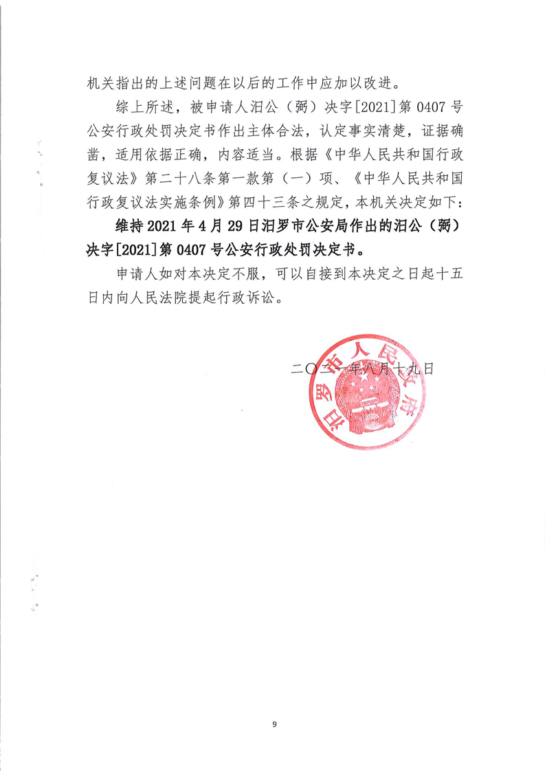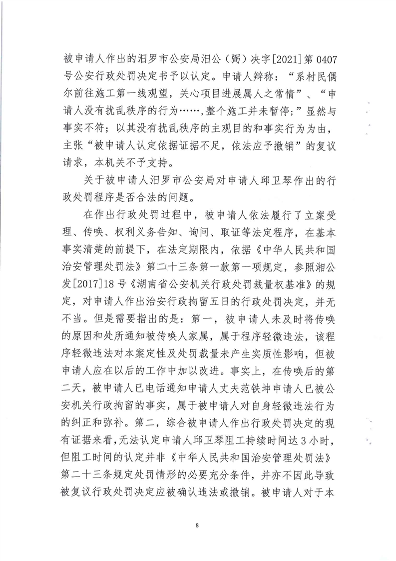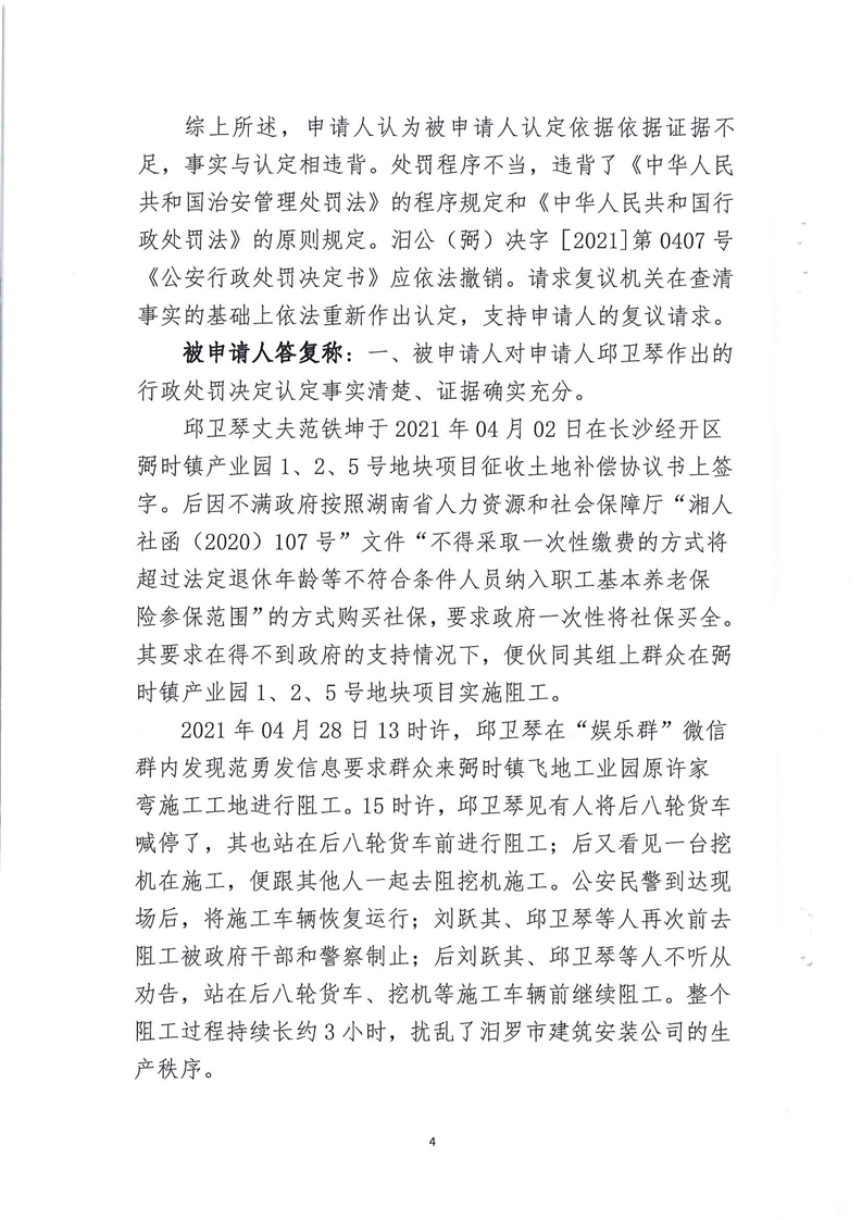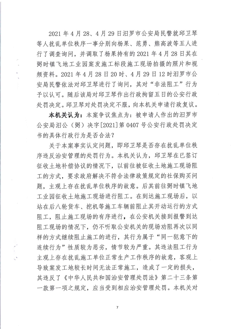 汨罗市人民政府行政复议决定书(邱卫琴)