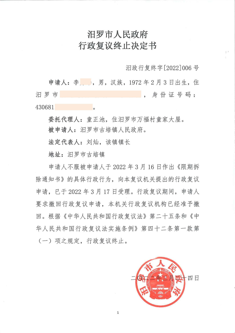 行政复议终止决定书(汨政行复终字[2022]006号