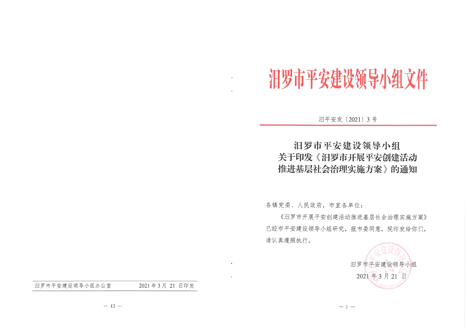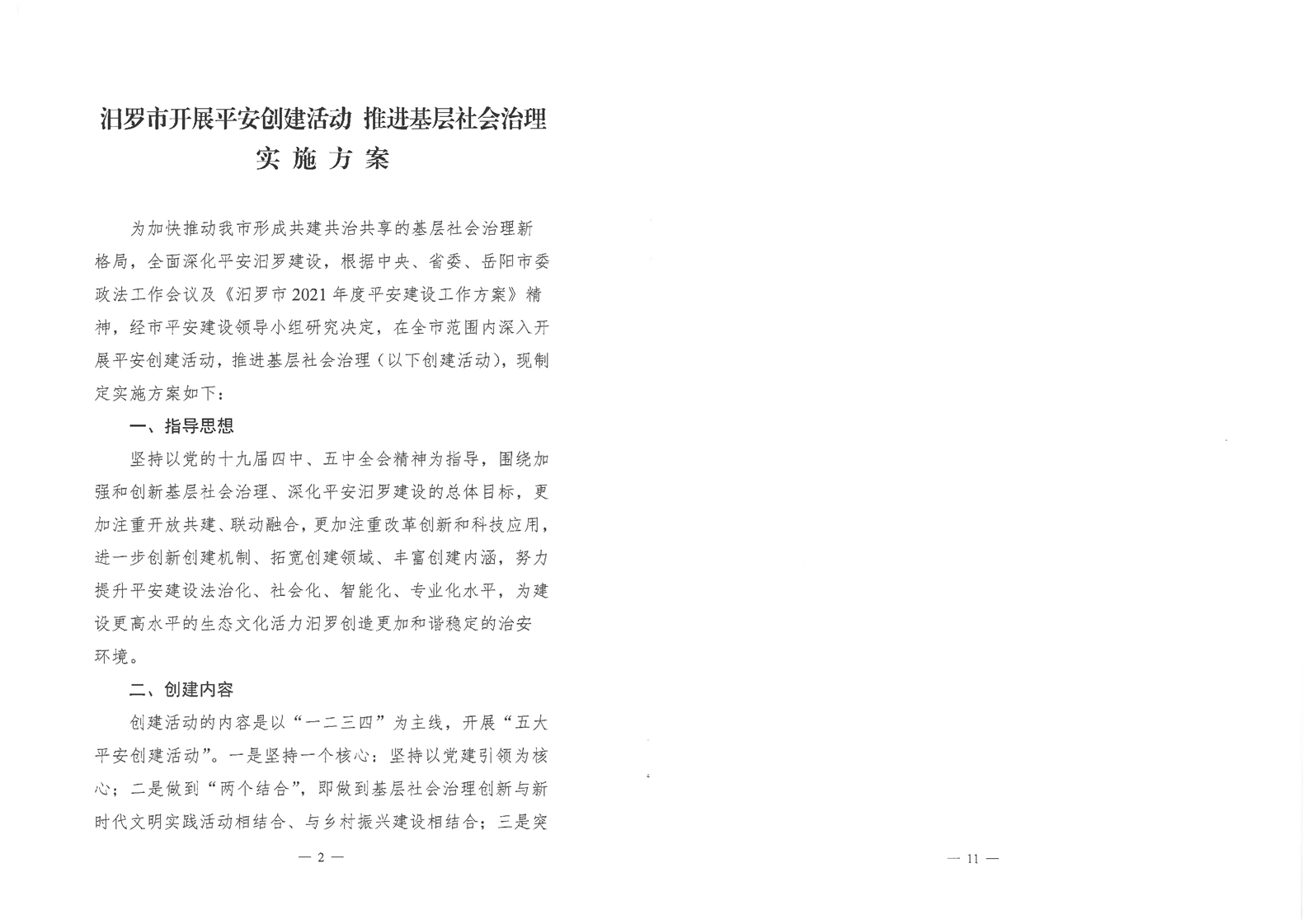 汨罗市开展平安创建,推进基层社会治理创新活动实施方案