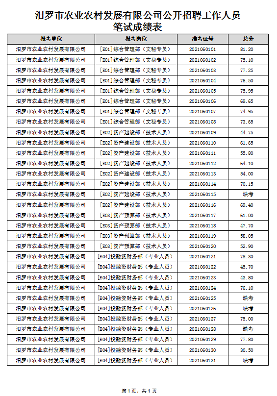 成绩公示‖汨罗市农业农村发展有限公司公开招聘工作人员笔试成绩公示