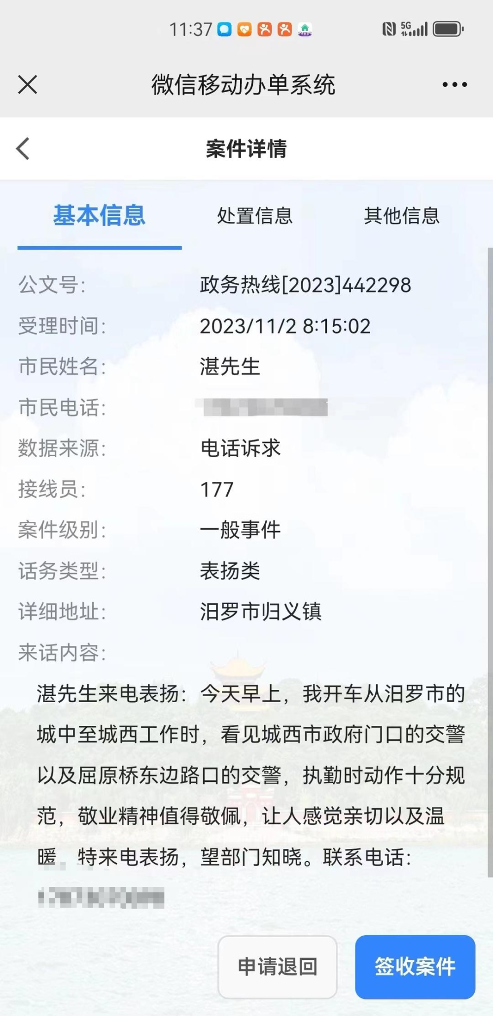 据了解,湛先生每天都要开车途经屈原桥,去往城西的工作单位上班。细心的他关注到屈原桥东边路口和城西市政府路段早、中、晚的交通高峰期,时刻都有交警坚守岗位维护秩序,且执勤交警手势规范,交通疏导尽职尽责,交通秩序井然有序。他每次经过看到这一幕,都感到非常暖心亲切,于是致电12345热线对城区交警执勤工作予以表扬。