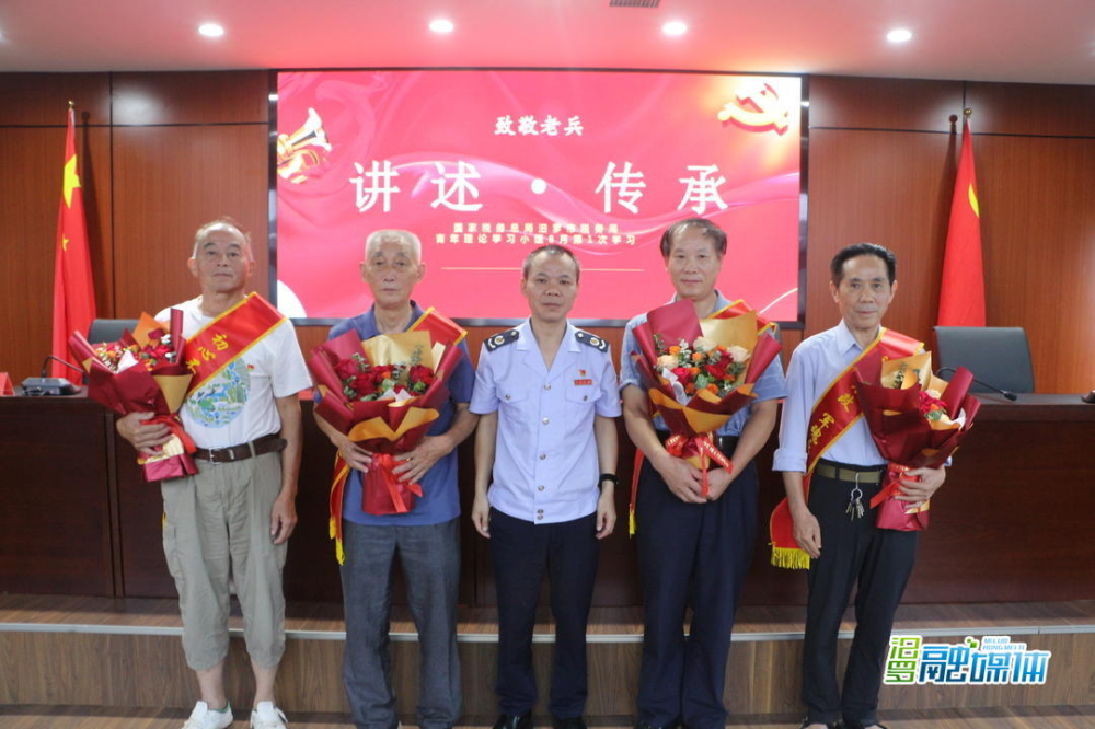 活动中,与会人员观看了《追光》纪录片,共同感受新时代人民军队的昂扬风貌。汨罗市税务局负责人为四位参加过对越自卫反击战的退休军转干部披上荣誉绶带,送上鲜花。