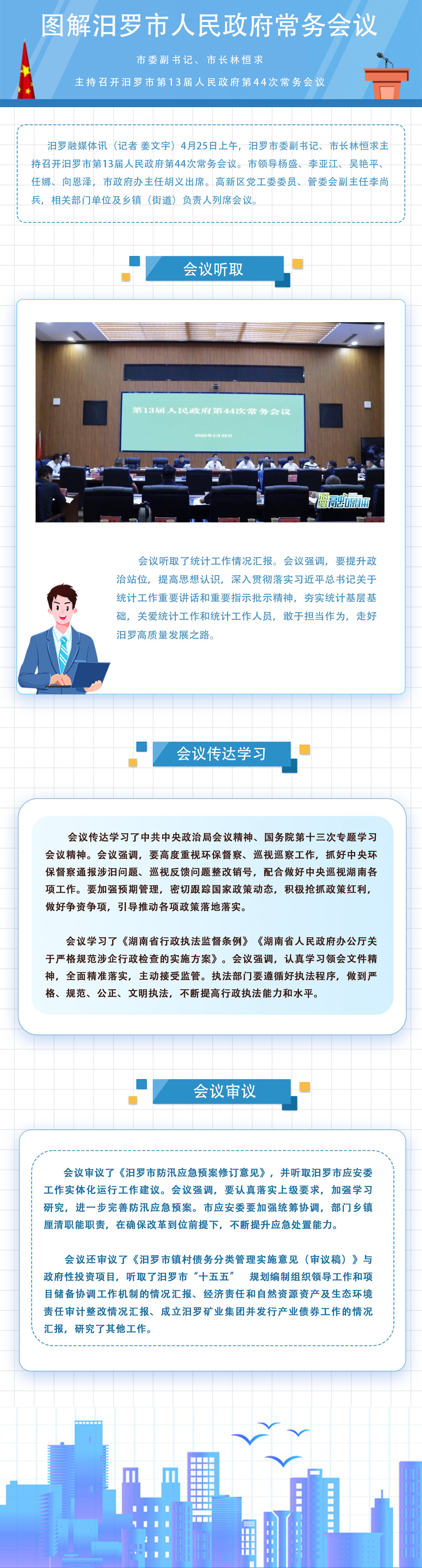会议听取了统计工作情况汇报。会议强调,要提升政治站位,提高思想认识,深入贯彻落实习近平总书记关于统计工作重要讲话和重要指示批示精神,夯实统计基层基础,关爱统计工作和统计工作人员,敢于担当作为,走好汨罗高质量发展之路。