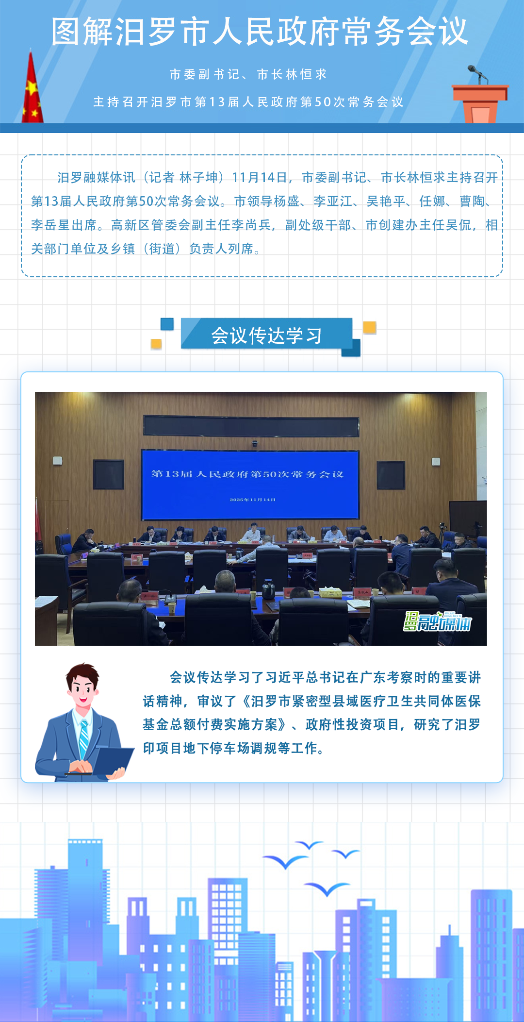 汨罗融媒体讯(记者 林子坤)11月14日,市委副书记、市长林恒求主持召开第13届人民政府第50次常务会议。市领导杨盛、李亚江、吴艳平、任娜、曹陶、李岳星出席。高新区管委会副主任李尚兵,副处级干部、市创建办主任吴侃,相关部门单位及乡镇(街道)负责人列席。