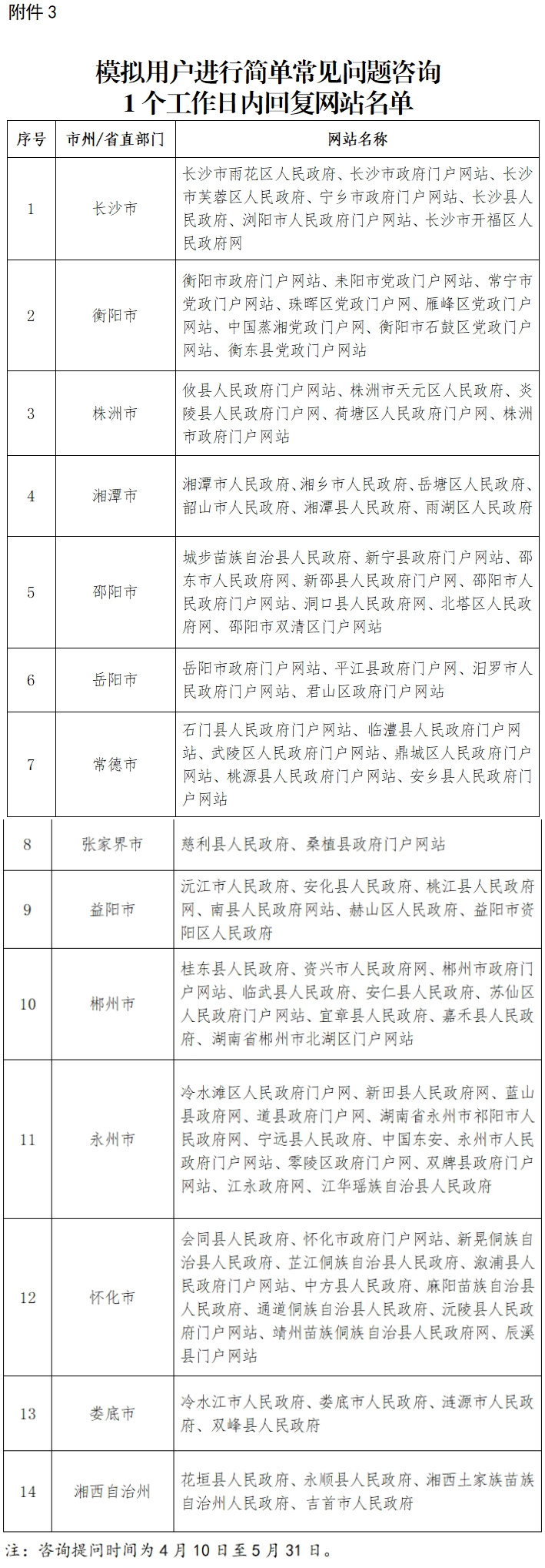 (二)政府网站互动渠道应用成效仍需提升。部分政府网站对网民简单常见问题咨询回复不及时,醴陵市人民政府、隆回县政府门户网站、绥宁县政府门户网站、武冈市政府门户网站、大祥区人民政府网、常德市人民政府门户网站、澧县人民政府门户网站、桂阳县政府门户网站8家网站对网民简单常见咨询问题5个工作日内未回复。个别网站未充分利用政府网站互动交流渠道开展调查征集,省文物局网站未提供在线调查征集渠道,省国资委、张家界市武陵源区等网站监测时间点前1年内开展的调查征集活动结束后1个月内未公开反馈结果。