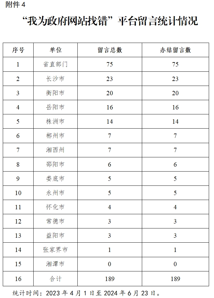 2024年第二季度,省数据局组织对全省正常运行的618家政府网站进行全覆盖检查,4家政府网站存在突出问题,总体合格率99.35%。4月1日至6月23日,全省共收到网民反馈的“我为政府网站找错”留言189条,按期办结率达100%。92家市州、县市区政府门户网站积极响应网民诉求,实现简单常见咨询问题在一个工作日内回复。全省各级政府门户网站在首页统一展示“中央生态环保督察”专题,有序做好信息公开工作。