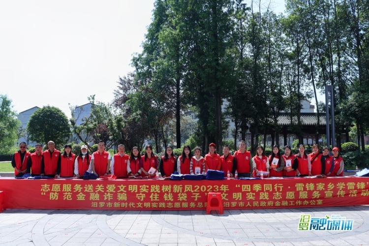 汨罗融媒体讯(记者 夏凡)志愿服务送关爱,⽂明实践树新⻛。4月26日上午,汨罗市2023年“四季同⾏·雷锋家乡学雷锋” “防范金融诈骗,守住钱袋⼦”⽂明实践志愿服务宣传活动,在欢乐水岸广场开展。