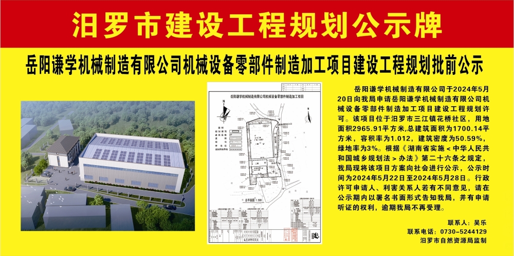 岳阳谦学机械制造有限公司机械设备零部件制造加工项目建设工程规划批前公示