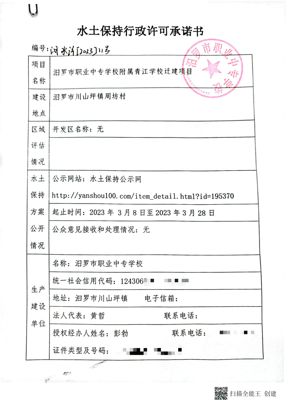 清江职业学校水土保持行政许可承诺书