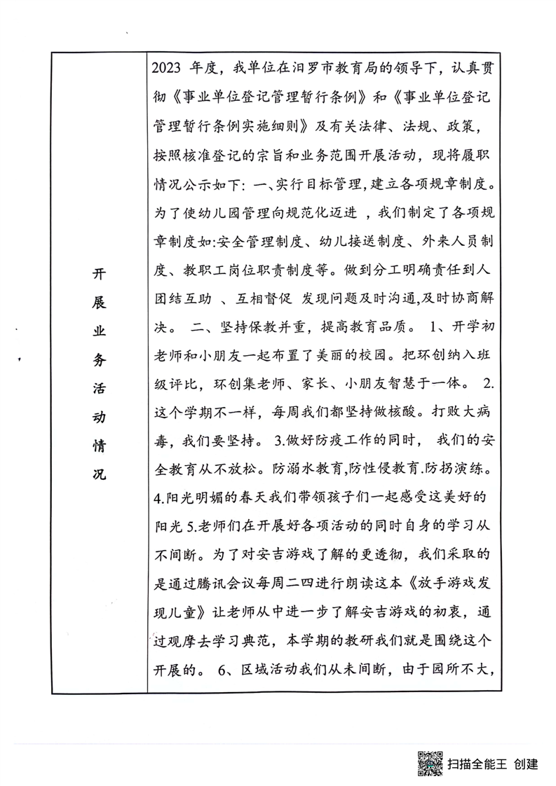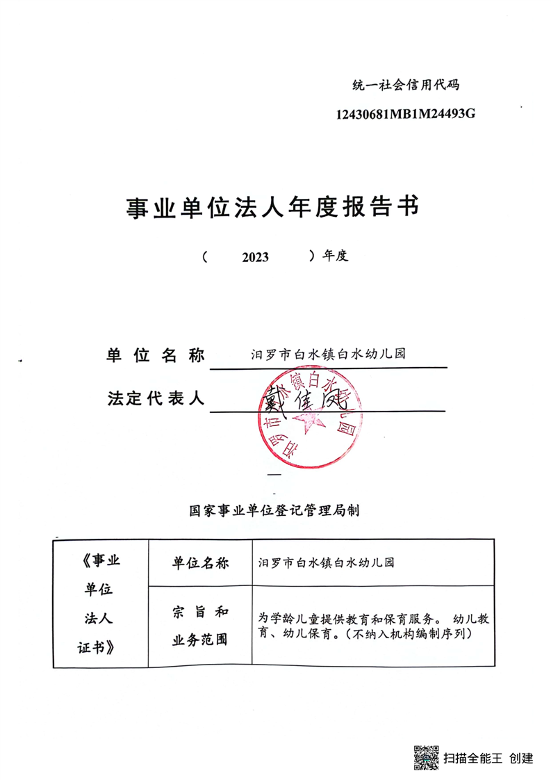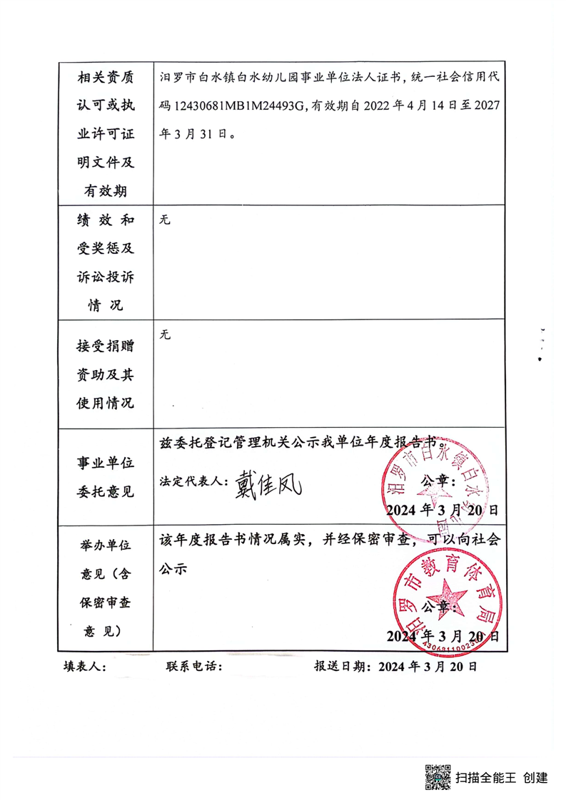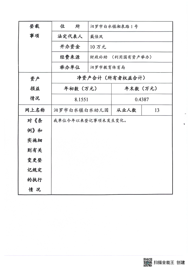 汨罗市白水镇白水幼儿园事业单位法人年度报告书