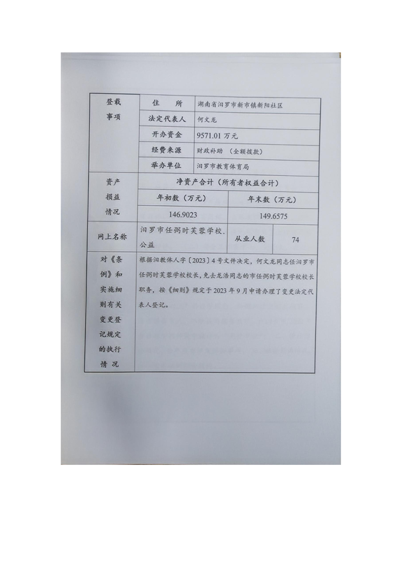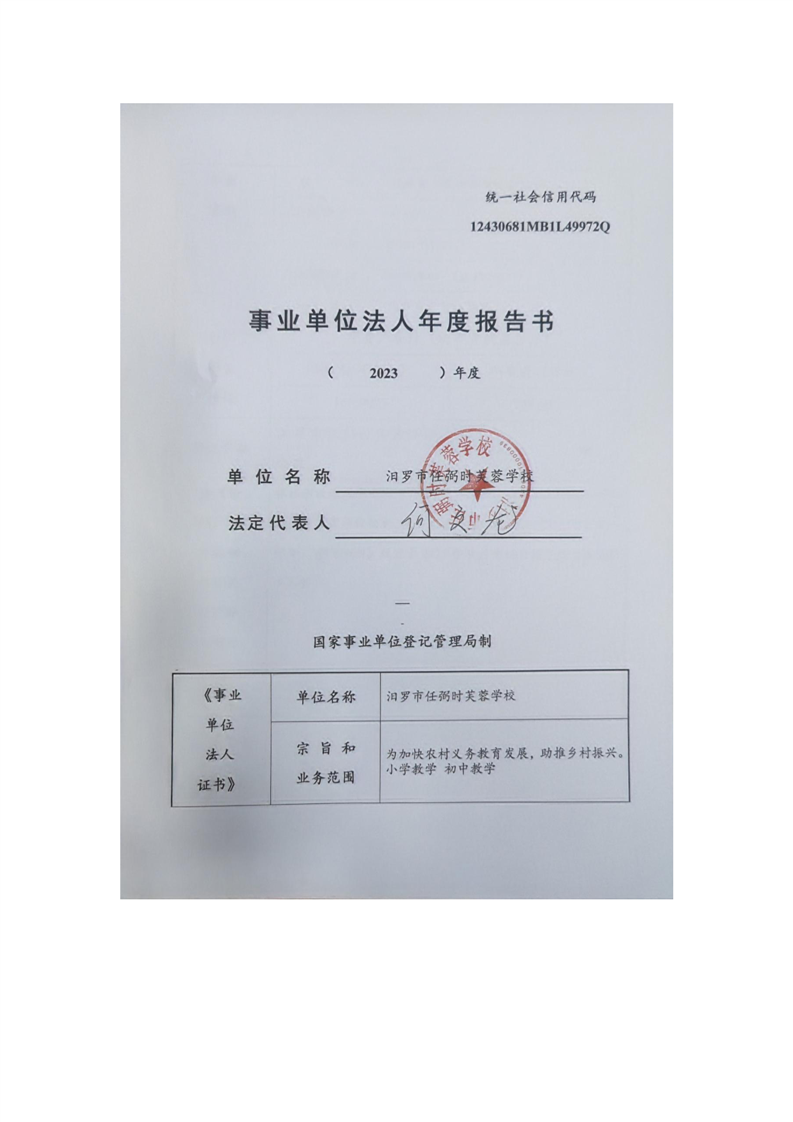 汨罗市任弼时芙蓉学校事业单位法人年度报告书