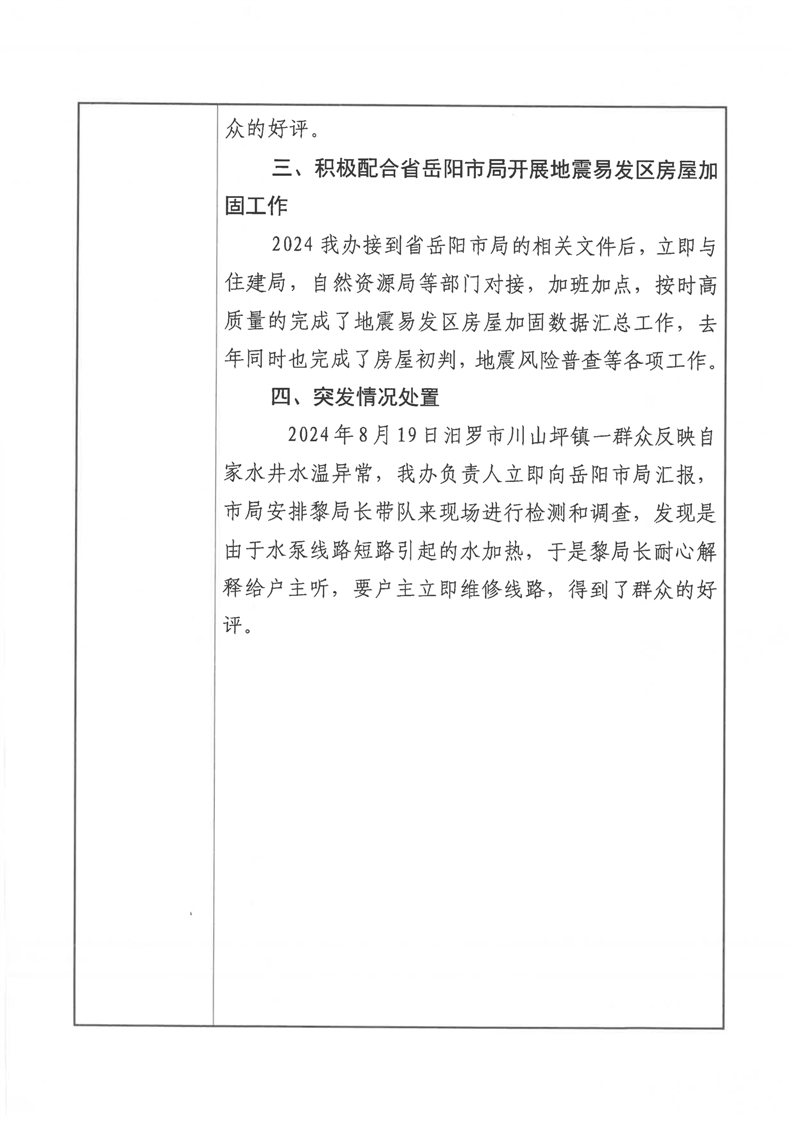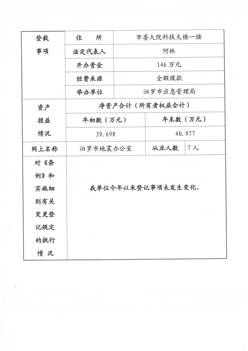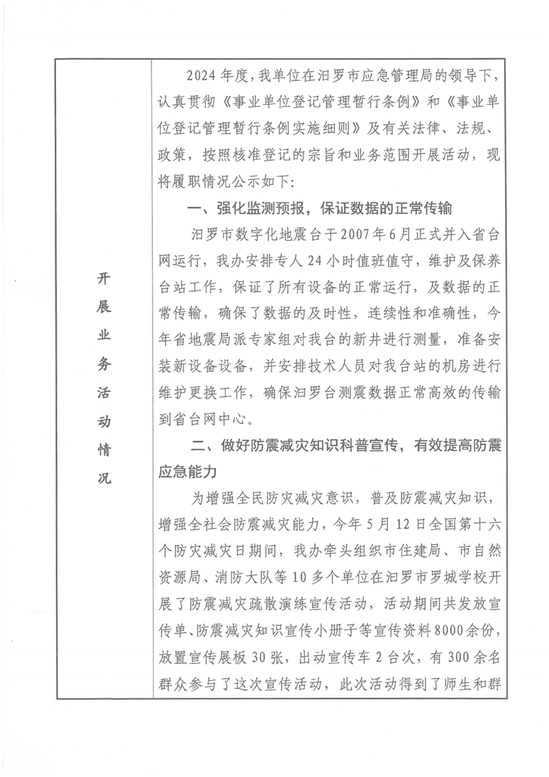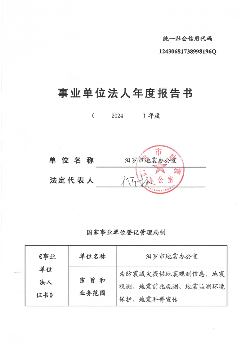 2024年汨罗市地震办公室事业单位法人年度报告书