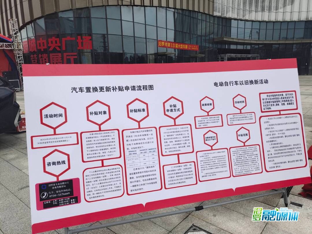 在汨罗市第13届大型车展现场,各种“以旧换新”宣传物料随处可见,销售员热情地给消费者介绍政策补贴及手续流程。