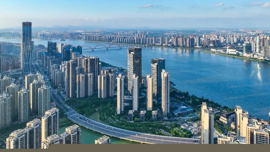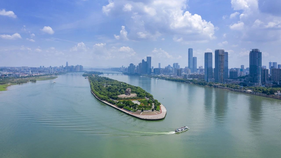 湖南金融中心在蓝天白云映衬下美如画卷。