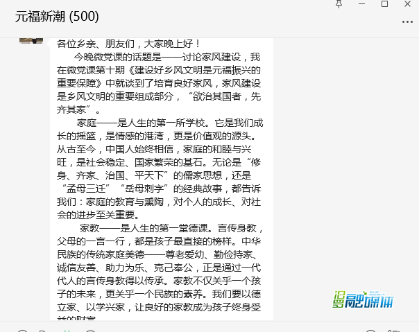 2018年初,在元福村急需统一思想、乡村建设急需升级加力的关键节点,江立云提议,并与时任村党总支书记韩玉辉及部分寓外乡友、党员干部商议,组建“元福新潮”微信群,用村民们熟悉的家乡话讲党课、话振兴,打破时空限制,让党员群众随时随地参与党课学习,让党的知识理论更易于被村民接受理解,为基层党建注入新活力。