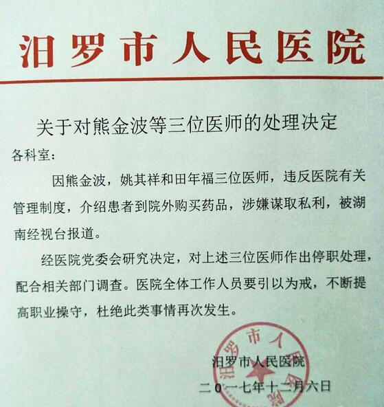 12月5日晚,湖南经视报道了人民医院三位医生介绍患者到院外购买药品,涉嫌从中谋取私利,医院高度重视,12月6号召开党委会,专题讨论处理办法及整改措施: