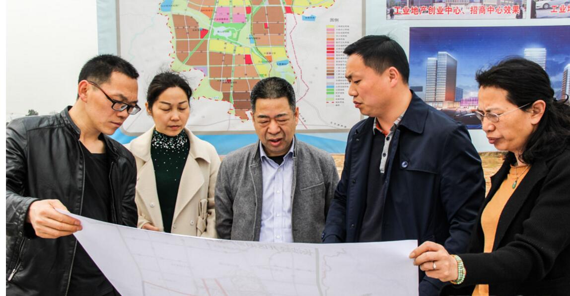 余国详(左三)详细了解”飞地“工业园发展规划,陈岭华(左二)陪同