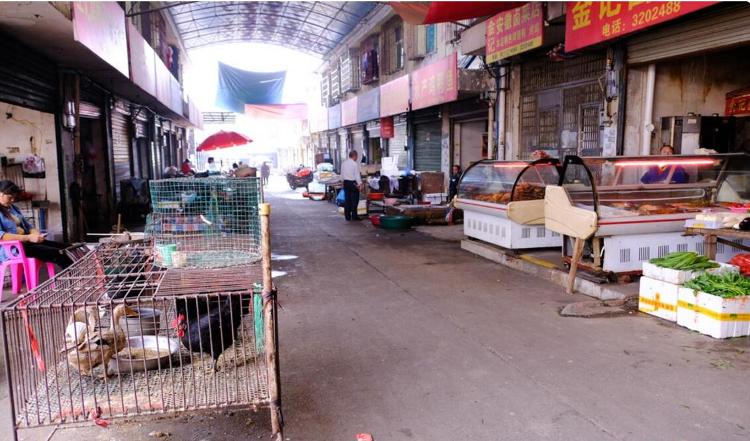 屈原北路市场,禽畜、熟食、水产等不同摊位紧密相邻